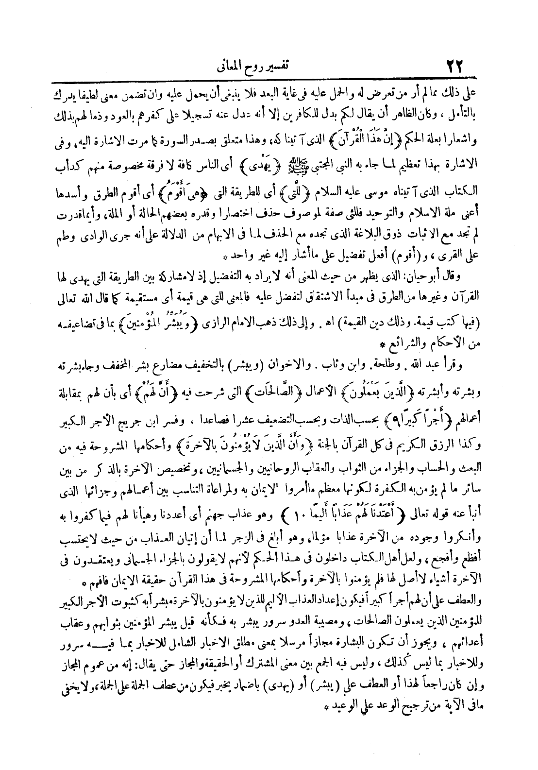 وقرأ عبد الله وطلحة وابن وثاب والإخوان ويبشر بالتخفيف مضارع بشر المخفف وجاء بشرته وبشرته وأبشرته الذين يعملون الأعمال الصالحات التي شرحت فيه أن لهم أي بأن لهم مقابلة أعمالهم أجرا كبيرا 9 بحسب الذات وبحسب التضعيف عشرا فصاعدا وفسر ابن جريج الأجر الكبير وكذا الرزق الكريم في كل القرآن بالجنة وأن الذين لا يؤمنون بالآخرة وأحكامها المشروحة فيه من البعث والحساب والجزاء من الثواب والعقاب الروحانيين والجسمانيين وتخصيص الآخرة بالذكر من بين سائر ما لم يؤمن به الكفرة لكونها معظم ما أمروا الإيمان به ولمراعاة التناسب بين أعمالهم وجزائها الذي أنبأ عنه قوله تعالى أعتدنا لهم عذابا أليما 01 وهو عذاب جهنم أي أعددنا وهيأنا لهم فيما كفروا به وأنكروا وجوده من الآخرة عذابا مؤلما وهو أبلغ من الزجر لما أن إيتان العذاب من حيث لا يحتسب أفظع وأفجع ولعل أهل الكتاب داخلون في هذا الحكم لأنهم لا يقولون بالجزاء الجسماني ويعتقدون في الآخرة أشياء لا أصل لها فلم يؤمنوا بالآخرة وأحكامها المشروحة في هذا القرآن حقيقة الإيمان فافهم