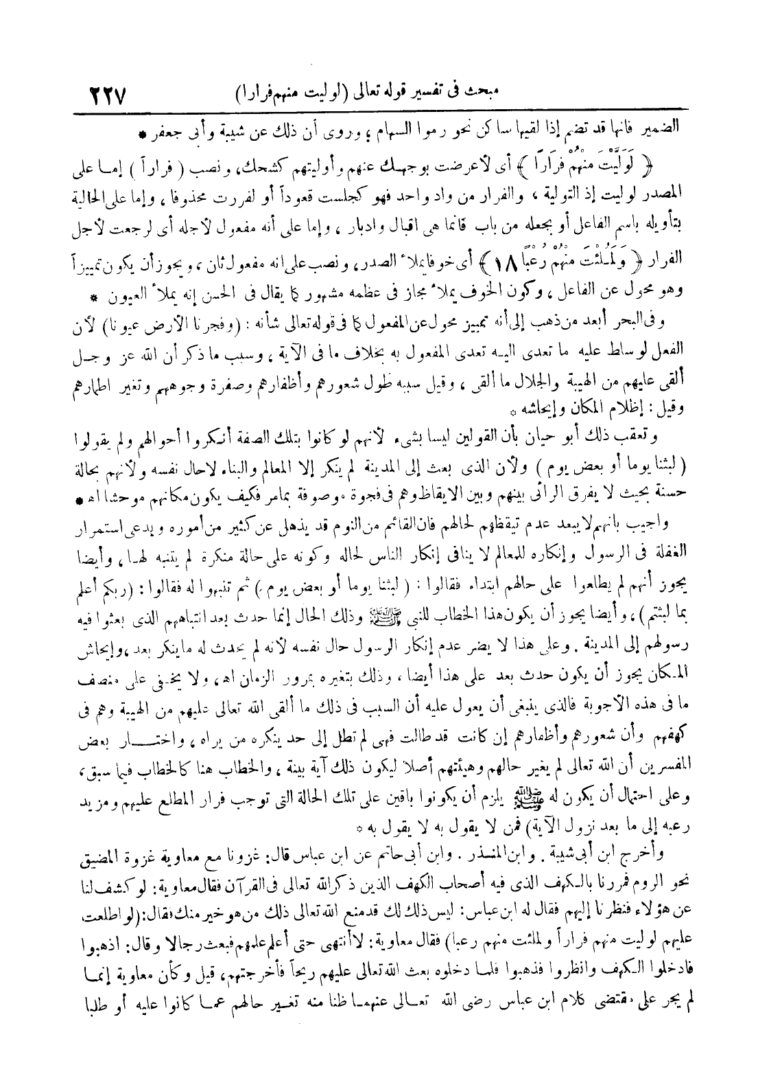 لوليت منهم فرارا أي لأعرضت بوجهك عنهم وأوليتهم كشحك ونصب فرارا إما على المصدر لوليت إذ التولية والفرار من واد واحد فهو كجلست قعودا أو لفررت محذوفا وإما على الحالية بتأويله باسم الفاعل أو بجعله من باب فإنما هي إقبال وإدبار وإما على أنه مفعول لأجله أي لرجعت لأجل الفرار ولملئت منهم رعبا 81 أي خوفا يملأ الصدر ونصب على أنه مفعول ثان ويجوز أن يكون تمييزا وهو محول عن الفاعل وكون الخوف يملأ مجاز في عظمه مشهور كما يقال في الحسن إنه يملأ العيون
