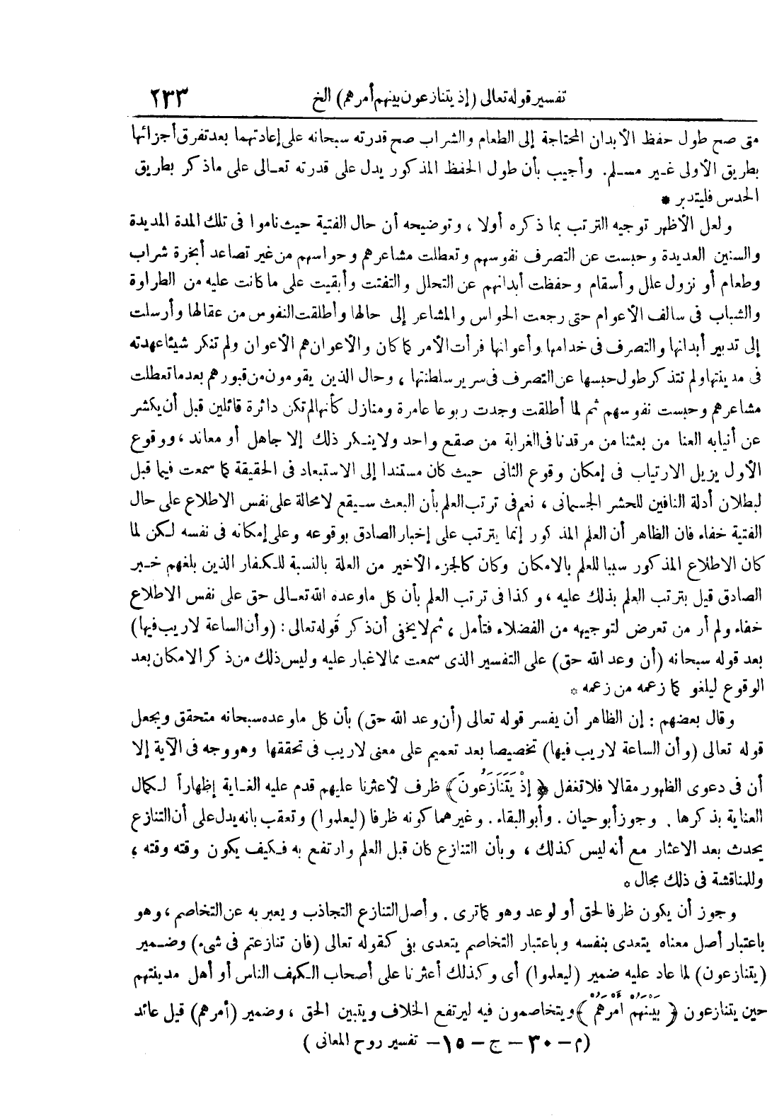 وقال بعضهم : إن الظاهر أن يفسر قوله تعالى أن وعد الله حق بأن كل ما وعده سبحانه متحقق ويجعل قوله تعالى وأن الساعة لا ريب فيها تخصيصا بعد تعميم على معنى لا ريب في تحققها وهو وجه في الآية إلا أن في دعوى الظهور مقالا فلا تغفل إذ يتنازعون ظرف لأعثرنا عليهم قدم عليه الغاية إظهارا لكمال العناية بذكرها وجوز أبو حيان وأبو البقاء وغيرهما كونه ظرفا ليعلموا وتعقب بأنه يدل على أن التنازع يحدث بعد الإعثار مع أنه ليس كذلك وبأن التنازع كان قبل العلم وارتفع به فكيف يكون وقته وقته وللمناقشة في ذلك مجال