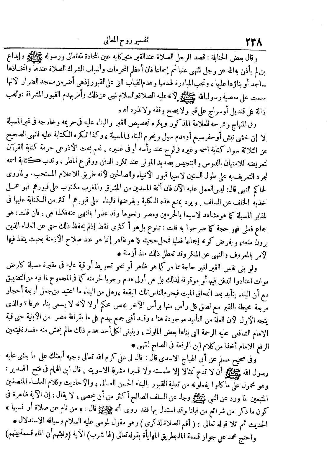 وفي صحيح مسلم عن أبي الهياج الأسدي قال : قال لي علي كرم الله وجهه أبعثك على ما بعثني عليه رسول الله أن لا تدع تمثالا إلا طمسته ولا قبرا مشرفا إلا سويته قال ابن الهمام في فتح القدير : وهو محمول على ما كانوا يفعلونه من تعلية القبور بالبناء الحسن العالي والأحاديث وكلام العلماء المنصفين المتبعين لما ورد عن النبي وجاء عن السلف الصالح أكثر من أن يحصى لا يقال : إن الآية ظاهرة في كون ما ذكر من شرائع من قبلنا وقد استدل بها فقد روي أنه قال : من نام عن صلاة أو نسيها الحديث ثم تلا قوله تعالى : أقم الصلاة لذكري وهو مقول لموسى عليه السلام وسياقه الاستدلال