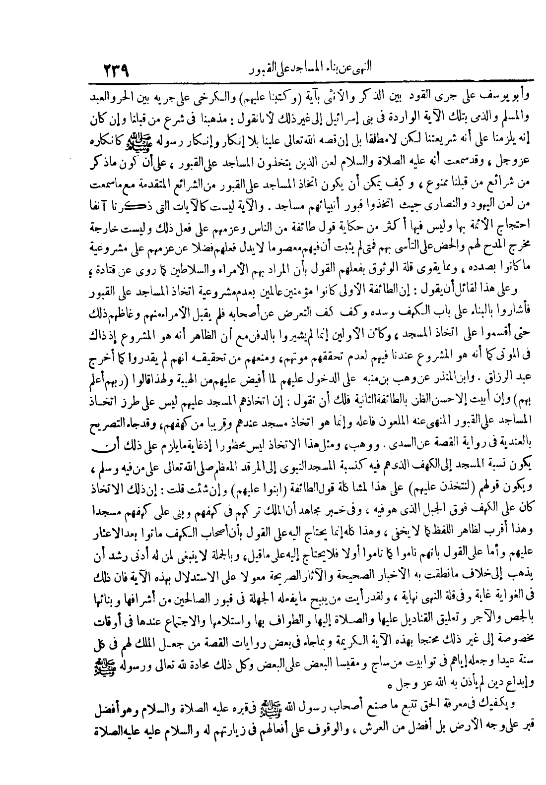 وأبو يوسف على جري القود بين الذكر والأنثى بآية وكتبنا عليهم والكرخي على جريه بين الحر والعبد والمسلم والذمي بتلك الآية الواردة في بني إسرائيل إلى غير ذلك لأنا نقول : مذهبنا في شرع من قبلنا وإن كان إنه يلزمنا على أن شريعتنا لكن لا مطلقا بل إن قصة الله تعالى علينا بلا إنكار وإنكار رسوله كإنكاره عز و جل وقد سمعت أنه عليه الصلاة و السلام لعن الذين يتخذون المساجد على القبور على أن كون ما ذكر من شرائع من قبلنا ممنوع وكيف يمكن أن يكون اتخاذ المساجد على القبور من الشرائع المتقدمة مع ما سمعت من لعن اليهود والنصارى حيث اتخذوا قبور أنبيائهم مساجد والآية ليس كالآيات التي ذكرنا آنفا احتجاج الأئمة بها وليس فيها أكثر من حكاية قول طائفة من الناس وعزمهم على فعل ذلك وليست خارجة مخرج المدح لهم والحض على التأسي بهم فمتى لم يثبت أن فيهم معصوما لا يدل فعلهم فضلا عن عزمهم على مشروعية ما كانوا بصدده ومما يقوي قلة الوثوق بفعلهم القول بأن المراد بهم الأمراء والسلاطين كما روي عن قتادة وعلى القائل أن يقول : إن الطائفة الأولى كانوا مؤمنين عالمين بعدم مشروعية اتخاذ المساجد على القبور فأشاروا بالبناء على باب الكهف وسده وكف كف التعرض عن أصحابه فلم يقبل الأمراء منهم وغاظهم ذلك حتى أقسموا على اتخاذ المسجد وكان الأولين إنما لم يشيروا بالدفن مع أن الظاهر أنه هو المشروع إذ ذاك في الموتى كما أنه هو المشروع عندنا فيهم لعدم تحققهم موتهم ومنعهم من تحقيقه أنهم لم يقدروا كما أخرج عبد الرزاق وابن المنذر عن وهب بن منبه على الدخول عليهم لما أفيض عليهم من الهيبة ولهذا قالوا ربهم أعلم بهم وإن أبيت إلا حسن الظن بالطائفة الثانية فلك أن تقول : إن اتخاذهم المسجد عليهم ليس على طرز اتخاذ المساجد على القبور المنهى عنه الملعون فاعله وإنما هو اتخاذ مسجد عندهم وقريبا من كهفهم وقد جاء التصريح بالعندية في رواية القصة عن السدي ووهب ومثل هذا الاتخاذ ليس محظورا إذ غاية ما يلزم على ذلك أن يكون نسبة المسجد إلى الكهف الذي هم فيه كنسبة المسجد النبوي إلى المرقد المعظم صلى الله تعالى على من فيه وسلم ويكون قولهم لنتخذن عليهم على هذا لمشاكلة قول الطائفة ابنوا عليهم وإن شئت قلت : إن ذلك الاتخاذ كان على الكهف فوق الجبل الذي هو فيه وفي خبر مجاهد أن الملك تركهم في كهفهم وبنى على كهفهم مسجدا وهذا أقرب لظاهر اللفظ كما لا يخفى وهذا كله إنما يحتاج إليه على القول بأن أصحاب الكهف ماتوا بعد الإعثار عليهم وأما على القول بأنهم ناموا كما ناموا أو لا فلا يحتاج إليه على ما قيل وبالجملة لا ينبغي لمن له أدنى رشد أن يذهب إلى خلاف ما نطقت به الأخبار الصحيحة والآثار الصريحة معولا على الاستدلال بهذه الآية فإن ذلك في الغواية غاية وفي قلة النهي نهاية وقد رأيت من يبيح ما يفعله الجهلة في قبور الصالحين من أشرافها وبنائه بالجص والآجر وتعليق القناديل عليها والصلاة إليها والطواف بها واستلامها والاجتماع عندها في أوقات مخصوصة إلى غير ذلك محتجا بهذه الآية الكريمة وبما جاء في بعض روايات القصة من جعل الملك لهم في كل سنة عيدا وجعله إياهم في توابيت من ساج ومقيسا البعض على البعض وكل ذلك محادة لله تعالى ورسوله وإبداع دين لم يأذن به الله عز و جل