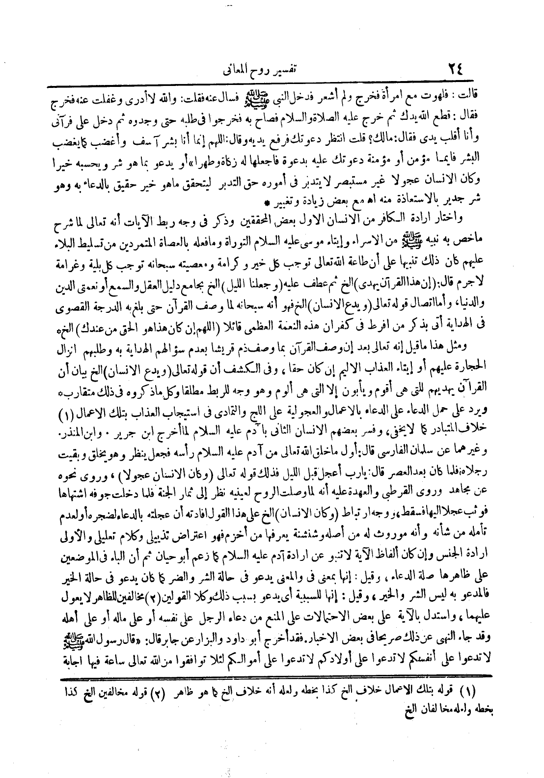 قالت : فلهوت مع امرأة فخرج ولم أشعر فدخل النبي فسأل عنه فقلت : والله لا أدري وغفلت عنه فخرج فقال : قطع الله يدك ثم خرج إلى الصلاة والسلام فصاح في طلبه حتى وجدوه ثم دخل علي فرآني وأنا أقلب يدي فقال : مالك قلت أنتظر دعوتك فرفع يديه وقال : اللهم أنا بشر آسف وأغضب كما يغضب البشر فأيما مؤمن أو مؤمنة دعوتك عليه بدعوة فاجعلها له زكاة وطهرا أو يدعو بما هو شر ويحسبه خيرا وكان الإنسان عجولا غير مستبصر لا يتدبر في أموره حق التدبر ليتحقق ما هو خير حقيق بالدعاء به وهو شر جدير بالاستعاذة منه ا ه مع بعض زيادة وتغيير