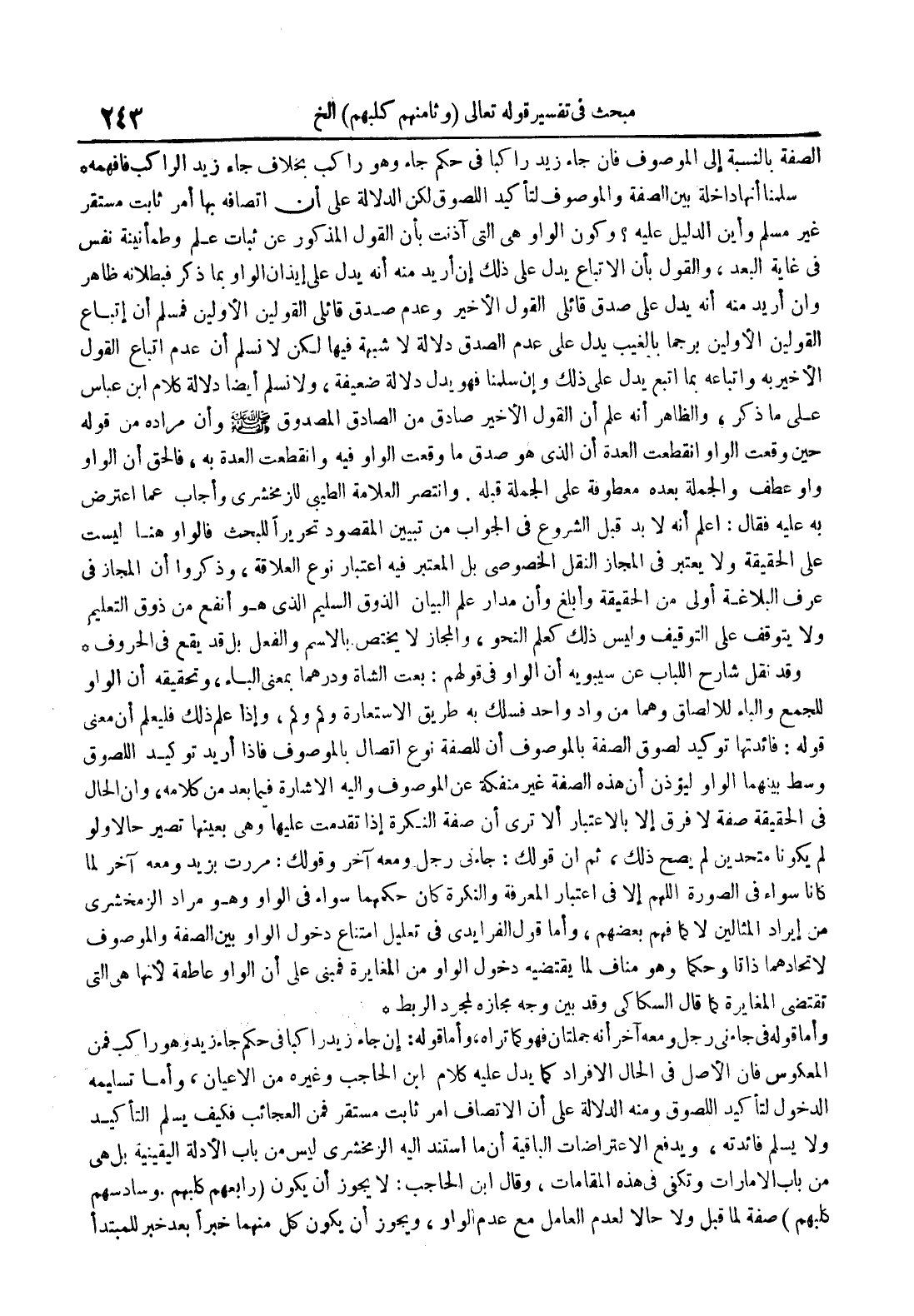 موأما قوله في جاءني رجل ومعه آخر أنه جملتان فهو كما تراه وأما قوله : إن جاء زيد راكبا في حكم جاء زيد وهو راكب فمن المعكوس فإن الأصل في الحال الإفراد كما يدل عليه كلام ابن الحاجب وغيره من الأعيان وأما تسليمه الدخول لتأكيد اللصوق ومنه الدلالة على أن الاتصاف أمر ثابت مستقر فمن العجائب فكيف يسلم التأكيد ولا يسلم فائدته ويدفع الاعتراضات الباقية أن ما استند إليه الزمخشري ليس من باب الأدلة اليقينية بل هي من باب الإمارات وتكفي في هذه المقامات وقال ابن الحاجب : لا يجوز أن يكون رابعهم كلبهم وسادسهم كلبهم صفة لما قبل ولا حالا لعدم العامل مع عدم الواو ويجوز أن يكون كل منهما خبرا بعد خبر للمبتدأ