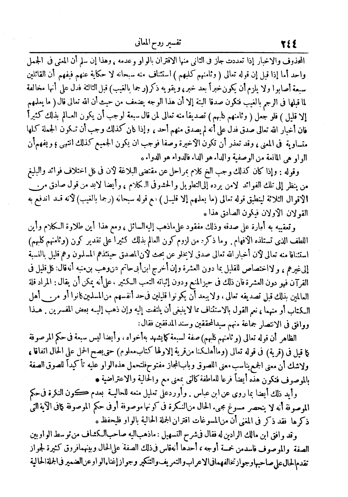 وتعقيبه به أمارة على صدقه وذلك مفقود على ما ذهب إليه السائل ومع هذا أين طلاوة الكلام وأين اللطف الذي تستلذه الأفهام وما ذكره من لزوم كون العالم بذلك كثيرا على تقدير كون وثامنهم كلبهم استئنافا منه تعالى لأن أخبار الله تعالى صدق لا يخلو عن بحث لأن المصدق حينئذ هم المسلمون وهم قليل بالنسبة إلى غيرهم ولا اختصاص للقليل بما دون العشرة وإن أخرج ابن أبي حاتم عن وهب بن منبه أنه قال : كل قليل في القرآن فهو دون العشرة فإن ذلك في حيز المنع ودون إثباته التعب الكثير على أنه يمكن أن يقال : المراد قلة العالمين بذلك قبل تصديقه تعالى ولا يبعد أن يكونوا قليلين في حد أنفسهم من المسلمين كانوا أو من أهل الكتاب أو منهما نعم القول بالاستئناف مما لا ينبغي أن يلتفت إليه وإن ذهب إليه بعض المفسرين هذا ووافق في الانتصار جماعة منهم سيد المحققين وسند المدققين فقال : الظاهر أن قوله تعالى وثامنهم كلبهم صفة لسبعة كما يشهد به أخواه وأيضا ليس سبعة في حكم الموصوفة كما قيل في قرية في قوله تعالى وما أهلكنا من قرية إلا ولها كتاب معلوم حتى يصح الحمل على الحال اتفاقا ولا شك أن معنى الجمع يناسب معنى اللصوق وباب المجاز مفتوح فتحمل هذه الواو عليه تأكيد اللصوق الصفة بالموصوف فتكون هذه أيضا فرعا للعاطفة كالتي بمعنى مع والحالية والاعتراضية