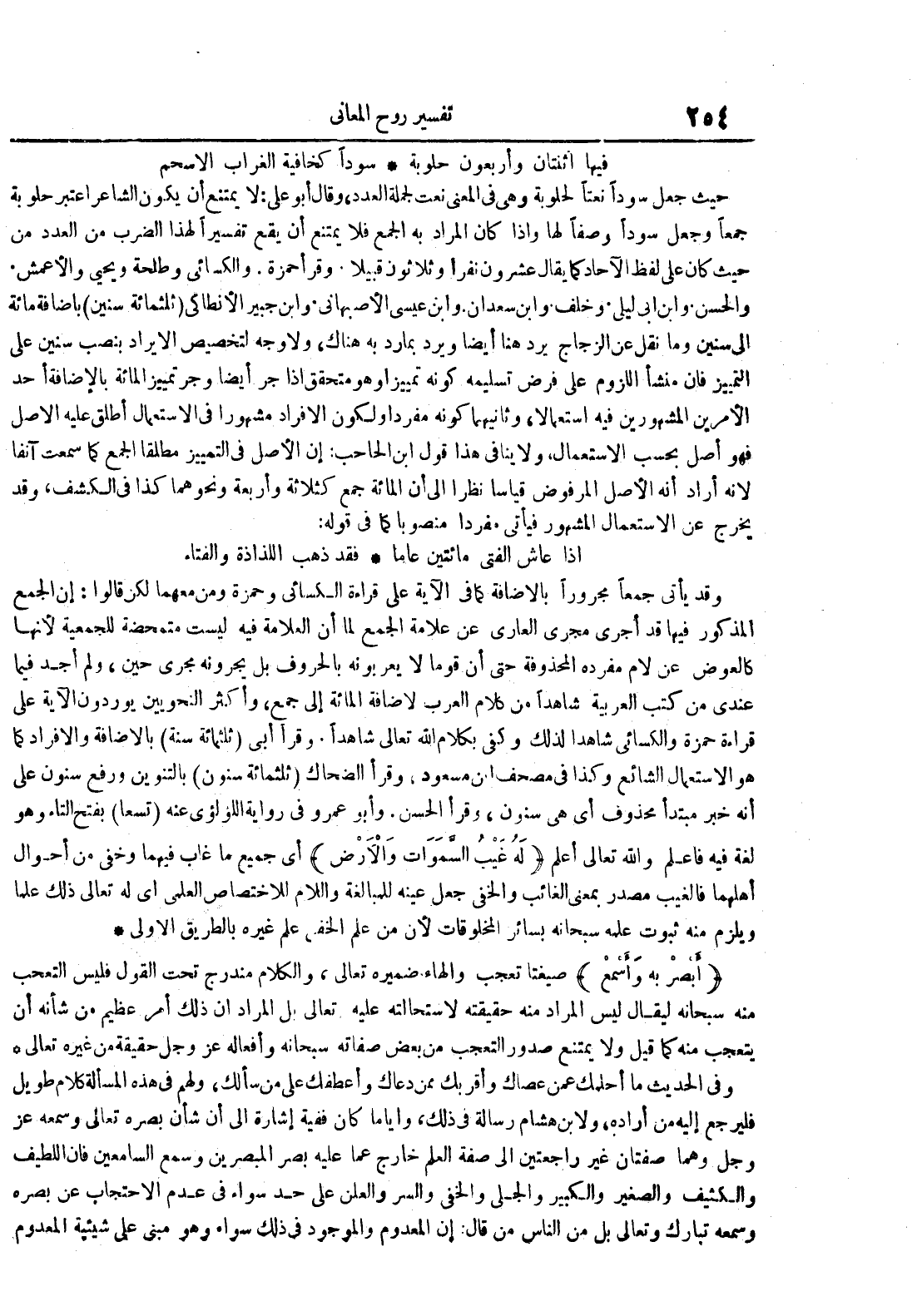 سودا كخافية الغراب الأسحم حيث جعل سودا نعتا لحلوبة وهي في المعنى نعت لجملة العدد وقال أبو علي : لا يمتنع أن يكون الشاعر اعتبر حلوبة جمعا وجعل سودا وصفا لها وإذا كان المراد به الجمع فلا يمتنع أن يقع تفسيرا لهذا الضرب من العدد من حيث كان على لفظ الآحاد كما يقال عشرون نفرا وثلاثون قبيلا وقرأ حمزة والكسائي وطلحة ويحيى والأعمش والحسن وابن أبي ليلى وخلف وابن سعدان وابن عيسى الأصبهاني وابن جبير الأنطاكي ثلثمائة سنين بإضافة مائة إلى سنين وما نقل عن الزجاج يرد هنا أيضا ويرد بما رد به هناك ولا وجه لتخصيص الايراد بنصب سنين على التمييز فإن منشأ اللزوم على فرض تسليمه كونه تمييزا وهو متحقق إذا جر تمييز المائة بالإضافة أحد الأمرين المشهورين فيه استعمالا وثانيهما كونه مفردا ولكون الأفراد مشهورا في الاستعمال أطلق عليه الأصل فهو أصل بحسب الاستعمال ولا ينافي هذا قول ابن الحاجب : إن الأصل في التمييز مطلقا الجمع كما سمعت آنفا لأنه أراد أنه الأصل المرفوض قياسا نظرا إلى أن المائة جمع كثلاثة وأربعة ونحوهما كذا في الكشف وقد يخرج عن الاستعمال المشهور فيأتي مفردا منصوبا كما في قوله : إذا عاش الفتى مائتين عاما
