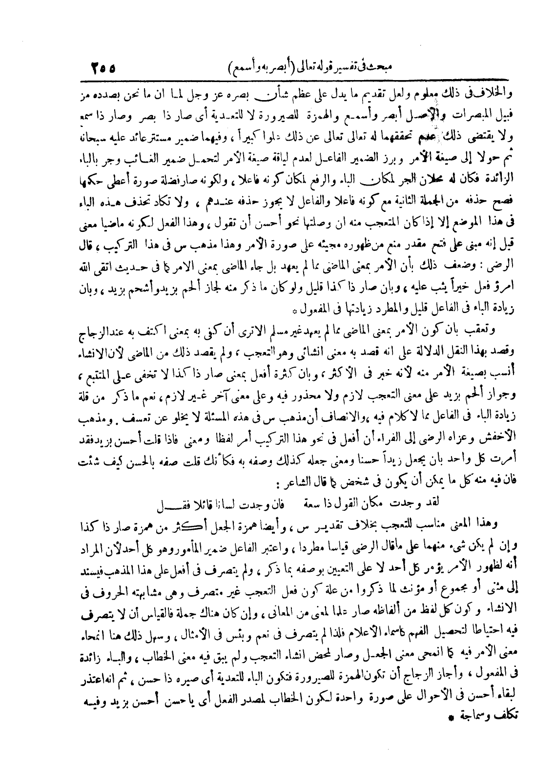 وتعقب بأن كون الأمر بمعنى الماضي مما لم يعهد غير مسلم ألا ترى أن كفى به بمعنى أكتف به عند الزجاج وقصد بهذا النقل الدلالة على أنه قصد به معنى انشائي وهو التعجب ولم يقصد ذلك من الماضي لأن الإنشاء أنسب بصيغة الأمر منه لأنه خبر في الأكثر وبأن كثره أفعل بمعنى صار ذا كذا لا تخفى على المتتبع وجواز ألحم بزيد على معنى التعجب لازم ولا محذور فيه وعلى معنى آخر غير لازم نعم ما ذكر من قلة زيادة الباء في الفاعل مما لا كلام فيه والإنصاف أن مذهب س في هذه المسئلة لا يخلو عن تعسف ومذهب الأخفش وعزاه الرضي إلى الفراء أن أفعل في نحو هذا التركيب أمر لفظا ومعنى فإذا قلت أحسن بزيد فقد أمرت كل واحد بأن يجعل زيدا حسنا ومعنى جعله كذلك وصفه به فكأنك قلت صفه بالحسن كيف شئت فإن فيه منه كل ما يمكن أن يكون في شخض كما قال الشاعر : لقد وجدت مكان القول ذا سعة فإن وجدت لسانا قائلا فقل وهذا المعنى مناسب للتعجب بخلاف تقدير س وأيضا همزة الجعل أكثر من همزة صار ذا كذا وإن لم يكن شيء منهما على ما قال الرضي قياسا مطردا واعتبر الفاعل ضميرا لمأمور وهو كل أحد لأن المراد أنه لظهور الأمر يؤمر كل أحد لا على التعيين بوصفه بما ذكر ولم يتصرف في أفعل على هذا المذهب فيسند إلى مثنى أو مجموع أو مؤنث لما ذكروا من علة كون فعل التعجب غير متصرف وهي مشابهته الحروف في الإنشاء وكون كل لفظ من ألفاظه صار علما لمعنى من المعاني وإن كان هناك جملة فالقياس أن لا يتصرف فيه احتياطا لتحصيل الفهم كأسماء الأعلام فلذا لم يتصرف في نعم وبئس في الأمثال وسهل ذلك هنا انمحاء معنى الأمر فيه كمن محى معنى الجعل وصار لمحض إنشاء التعجب ولم يبق فيه معنى الخطاب والباء زائدة في المفعول وأجاز الزجاج أن تكون الهمزة للصيرورة فتكون الباء للتعدية أي صيره ذا حسن ثم أنه اعتذر لبقاء أحسن في الأحوال على صورة واحدة لكون الخطاب لمصدر الفعل أي يا حسن أحسن بزيد وفيه تكلف وسماجة