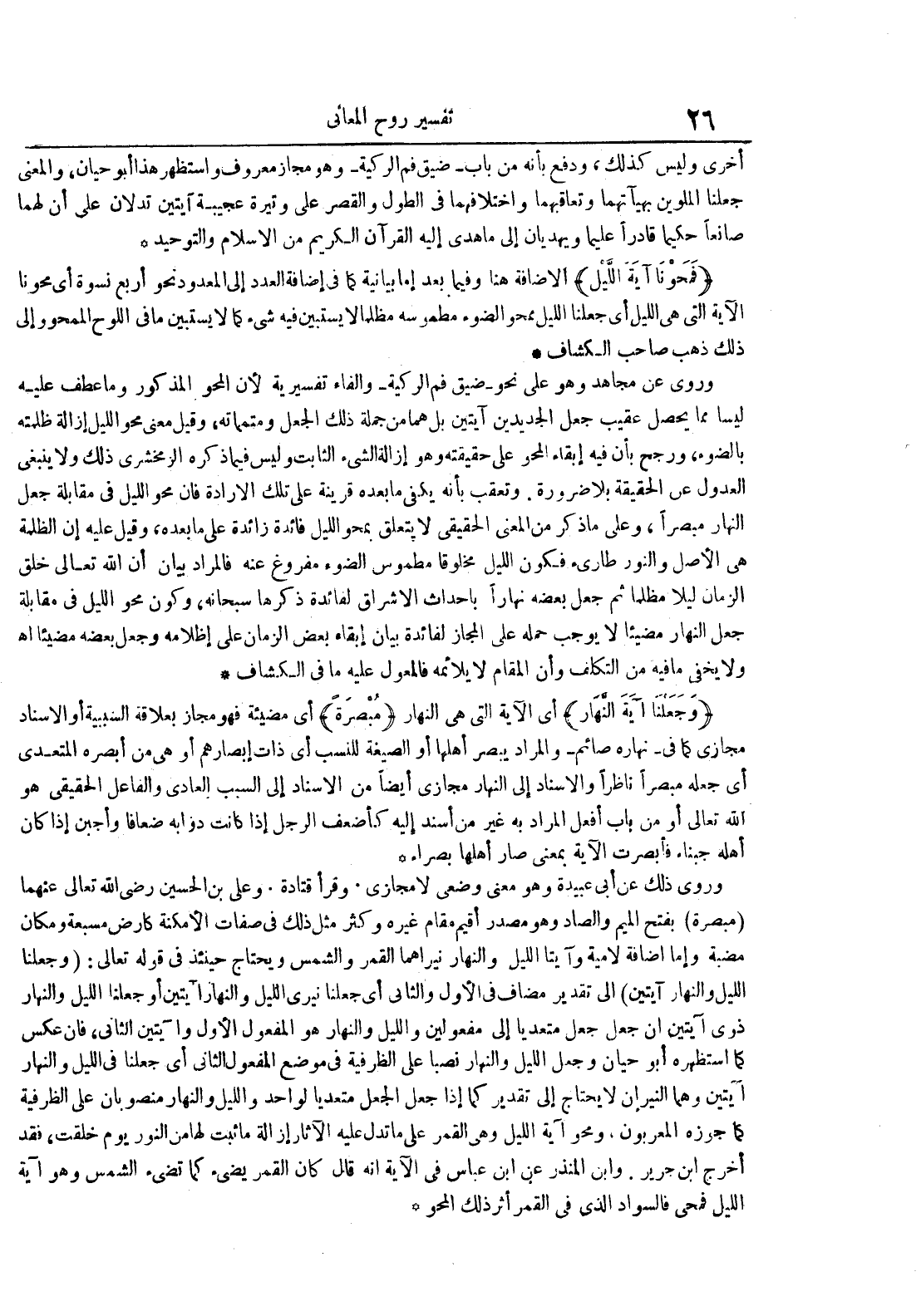 وروي ذلك عن أبي عبيدة وهو معنى وضعي لا مجازي وقرأ قتادة وعلي بن الحسين رضي الله تعالى عنهما مبصرة بفتح الميم والصاد وهو مصدر أقيم مقام غيره وكثر مثل ذلك في صفات الأمكنة كأرض مسبعة ومكان مضبة وإما إضافة لامية وآيتا الليل والنهار نيراهما القمر والشمس ويحتاج حينئذ في قوله تعالى : وجعلنا الليل والنهار آيتين إلى تقدير مضاف في الأول والثاني أي جعلنا نيري الليل والنهار آيتين أو جعلنا الليل والنهار ذوي آيتين أن جعل جعل متعديا إلى مفعولين والليل والنهار هو المفعول الأول وآيتين الثاني فإن عكس كما استظهره أبو حيان وجعل الليل والنهار نصبا على الظرفية في موضع المفعول الثاني أي جعلنا في الليل والنهار آيتين وهما النيران لا يحتاج إلى تقدير كما إذا جعل الجعل متعديا لواحد والليل والنهار منصوبان على الظرفية كما جوزه المعربون ومحو آية الليل وهي القمر على ما تدل عليه الآثار إزالة ما ثبت لها من النور يوم خلقت فقد أخرج ابن جرير وابن المنذر عن ابن عباس في الآية أنه قال : كان القمر يضيء كما تضيء الشمس وهو آية الليل فمحي فالسواد الذي في القمر أثر ذلك المحو