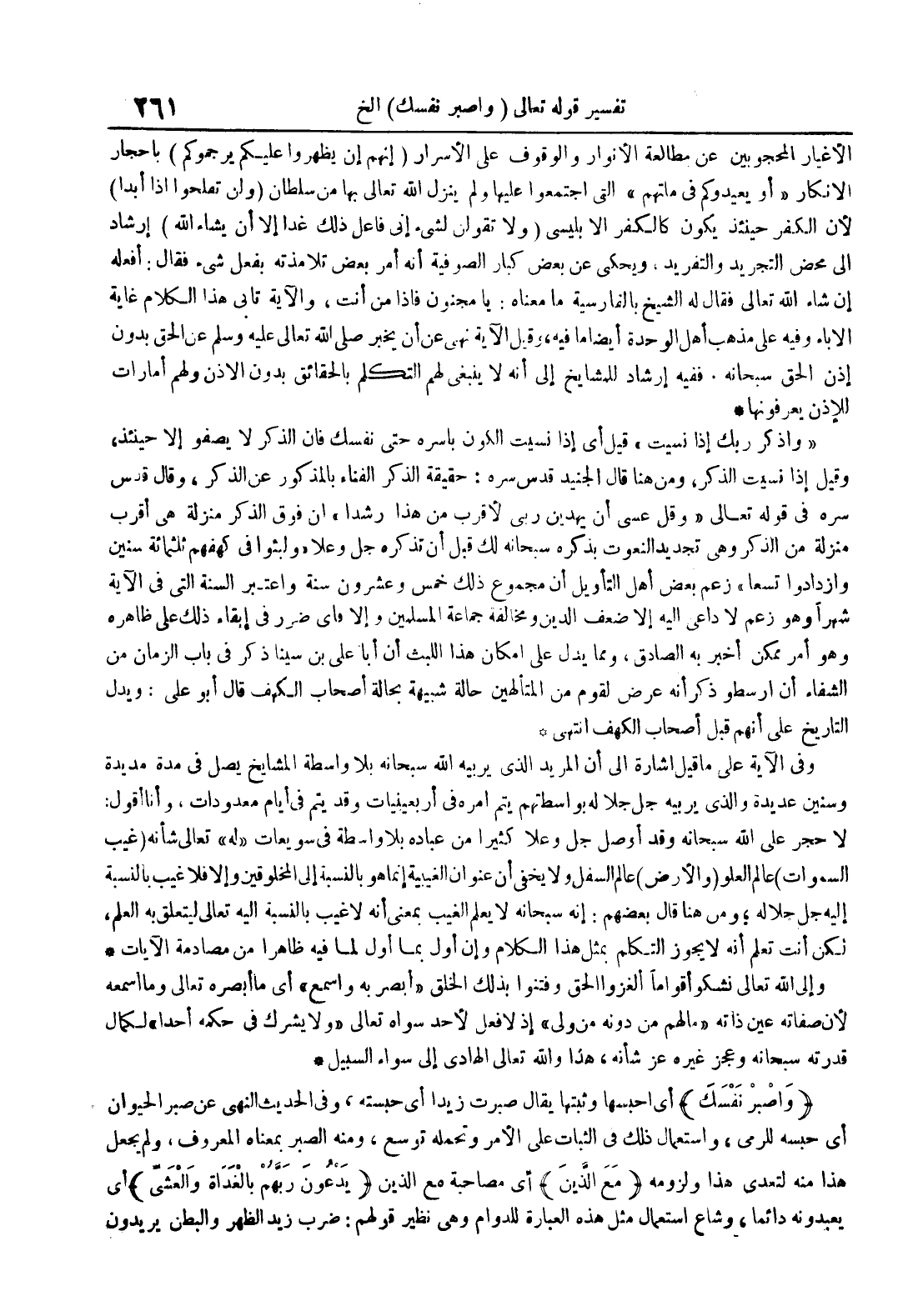 واذكر ربك إذا نسيت قيل أي إذا نسيت الكون بأسره حتى نفسك فإن الذكر لا يصفو إلا حينئذ وقيل إذا نسيت الذكر ومن هنا قال الجنيد قدس سره : حقيقة الذكر الفناء بالمذكور عن الذكر وقال قدس سره في قوله تعالى وقل عسى أن يهديني ربي لأقرب من هذا رشدا إن فوق الذكر منزلة هي أقرب منزلة من الذكر وهي تشديد النعوت بذكره سبحانه لك قبل أن تذكره جل وعلا ولبثوا في كهفهم ثلثمائة سنين وازدادوا تسعا زعم بعض أهل التأويل أن مجموع ذلك خمس وعشرون سنة واعتبر السنة التي في الآية شهرا وهو زعم لا داعي إليه إلا ضعف الدين ومخالفة جماعة المسلمين وإلا فأي ضرر في إبقاء ذلك على ظاهره وهو أمر ممكن أخبر به الصادق ومما يدل على إمكان هذا اللبث أن أبا علي بن سينا ذكر في الباب الزمان من الشفاء أن أرسطو ذكر أنه عرض لقوم من المتألهين حالة شبيهة بحالة أصحاب الكهف قال أبو علي : ويدل التاريخ على أنهم قبل أصحاب الكهف