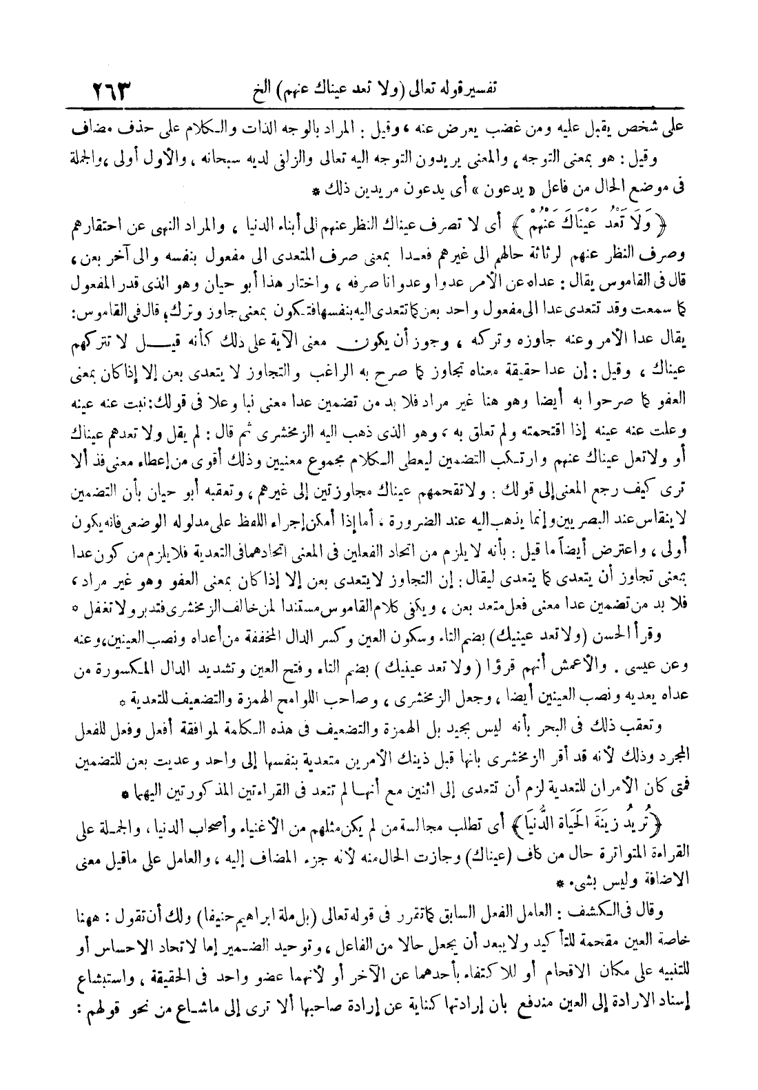 ولا تعد عيناك عنهم أي لا تصرف عيناك النظر عنهم إلى أبناء الدنيا والمراد النهي عن احتقارهم وصرف النظر عنهم لرثاثة حالهم إلى غيرهم فعدا بمعنى صرف المعتدي إلى مفعول بنفسه وإلى آخر بعن قال في القاموس يقال : عداه عن الأمر عدوا وعدوانا صرفه واختار هذا أبو حيان وهو الذي قدر المفعول كما سمعت وقد تتعدى عدا إلى مفعول واحد بعن كما تتعدى إليه بنفسها فتكون بمعنى جاوز وترك قال في القاموس : يقال عدا الأمر وعنه جاوزه وتركه وجوز أن يكون معنى الآية على ذلك كأنه قيل لا تتركهم عيناك وقيل : إن عدا حقيقة معناه تجاوز كما صرح به الراغب والتجاوز لا يتعدى بعن إلا إذا كان بمعنى العفو كما صرحوا به أيضا وهو هنا غير مراد فلا بد من تضمين عدا معنى نبا وعلا في قولك : نبت عنه عينه وعلت عنه عينه إذا اقتحمته ولم تعلق به وهو الذي ذهب إليه الزمخشري ثم قال : لم يقل ولا تعدهم عيناك أو ولا تعل عيناك عنهم وارتكب التضمين ليعطى الكلام مجموع معنيين وذلك أقوى من إعطاء معنى فذ ألا ترى كيف رجع المعنى إلى قولك : ولا تقحمهم عيناك مجاوزتين إلى غيرهم وتعقبه أبو حيان بأن التضمين لا ينقاس عند البصريين وإنما يذهب إليه عند الضرورة أما إذا أمكن إجراء اللفظ على مدلوله الوضعي فإنه يكون أولى واعترض أيضا ما قيل : بأنه لا يلزم من اتحاد الفعلين في المعنى اتحادهما في التعدية فلا يلزم من كون عدا بمعنى تجاوز أن يتعدى كما يتعدى ليقال : إن التجاوز لا يتعدى بعن إلا إذا كان بمعنى العفو وهو غير مراد فلا بد من تضمين عدا معنى فعل متعد بعن ويكفي كلام القاموس مستندا لمن خالف الزمخشري فتدبر ولا تغفل