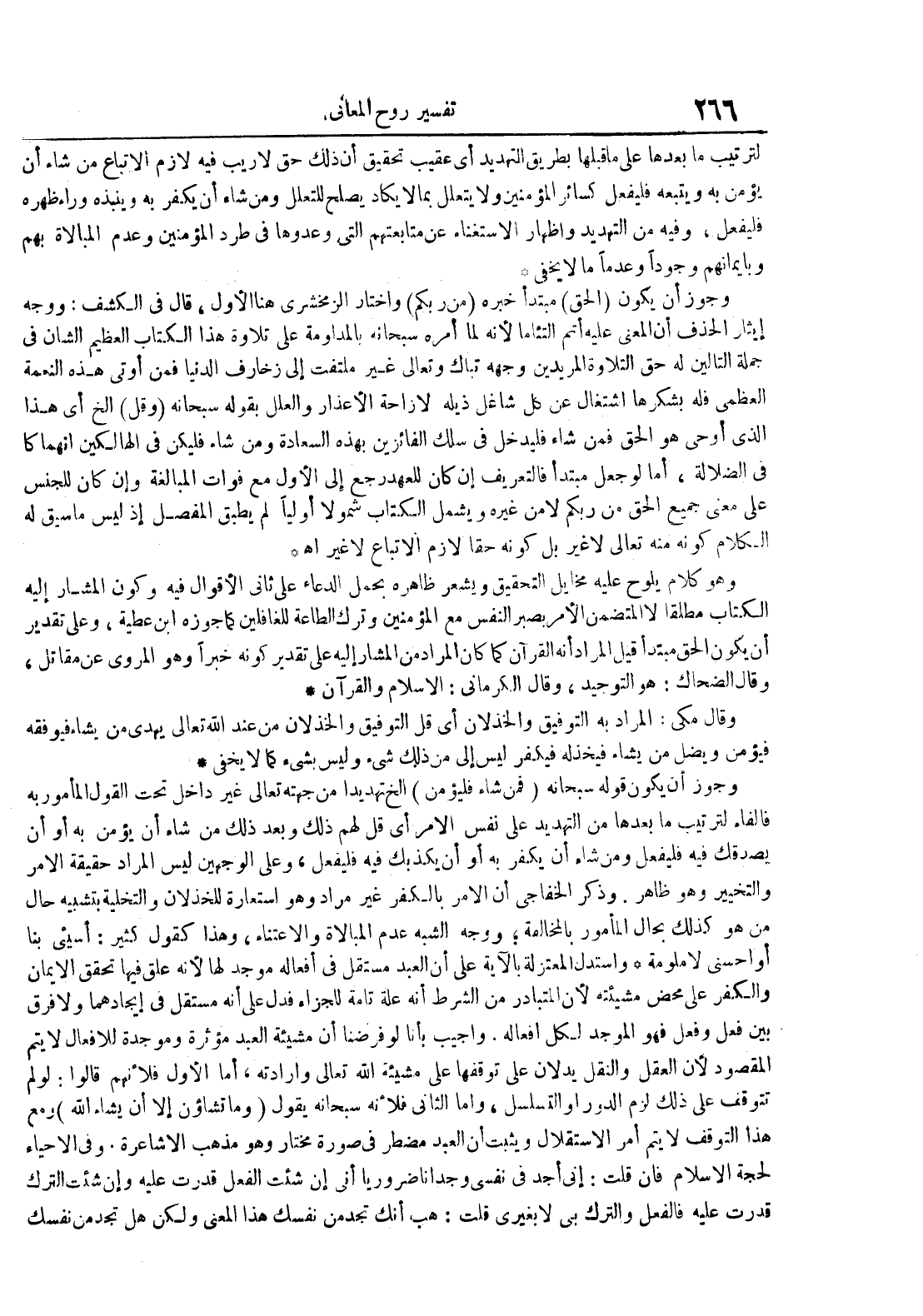 واستدل المعتزلة بالآية على أن العبد مستقل في افعاله موجد لها لأنه علق فيها تحقق الإيمان والكفر على محض مشيئته لأن المتبادر من الشرط أنه علة تامة للجزاء فدل على أنه مستقل في إيجادهما ولا فرق بين فعل وفعل فهو الموجد لكل أفعاله وأجيب بأنا لو فرضنا أن مشيئة العبد مؤثرة وموجدة للأفعال لا يتم المقصود لأن العقل والنقل يدلان على توقفها على مشيئة الله تعالى وإرادته أما الأول فلأنهم قالوا : لو لم تتوقف على ذلك لزم الدور أو التسلسل وأما الثاني فلأنه سبحانه يقول وما تشاؤون إلا أن يشاء الله ومع هذا التوقف لا يتم أمر الاستقلال ويثبت أن العبد مضطر في صورة مختار وهو مذهب الأشاعرة وفي الإحياء لحجة الإسلام فإن قلت : إني أجد في نفسي وجدانا ضروريا إني إن شئت الفعل قدرت عليه وإن شئت الترك قدرت عليه فالفعل والترك بي لا بغيري قلت : هب أنك تجد من نفسك هذا المعنى ولكن هل تجد من نفسك