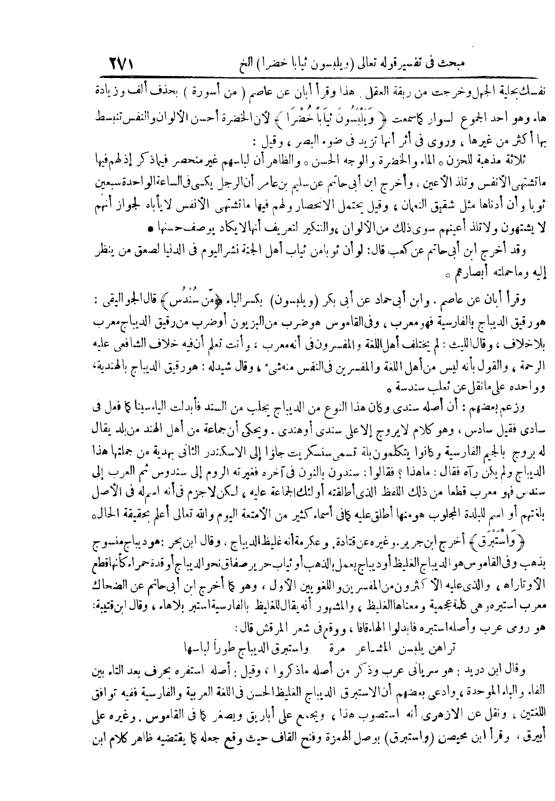 وقرأ أبان عن عاصم وابن أبي حماد عن أبي بكر ويلبسون بكسر الباء من سندس قال الجواليقي : هو رقيق الديباج بالفارسية فهو معرب وفي القاموس هو ضرب من البزيون أو ضرب من رقيق الديباج معرب بلا خلاف وقال الليث : لم يختلف أهل الجنة والمفسرون في أنه معرب وأنت تعلم أن فيه خلاف الشافعي عليه الرحمة والقول بأنه ليس من أهل اللغة والمفسرين في النفس منه شيء وقال شيدله : هو رقيق الديباج بالهندية وواحدة على ما نقل عن ثعلب سندسة