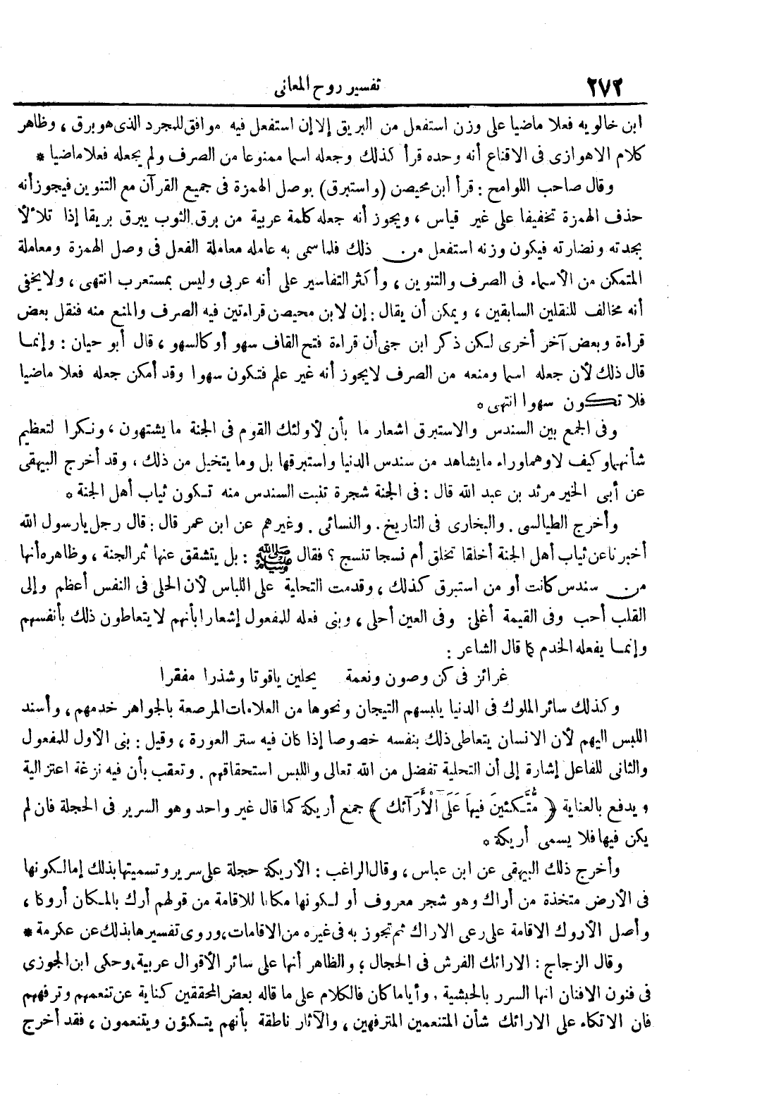 وأخرج الطيالسي والبخاري في التاريخ والنسائي وغيرهم عن ابن عمر قال : قال رجل يا رسول الله أخبرنا عن ثياب أهل الجنة أخلقا تخلق أم نسجا تنسج فقال : بل يتشقق عنها ثمر الجنة وظاهره أنها من سندس كانت أو من استبرق كذلك وقدمت التحلية على اللباس لأن الحلي في النفس أعظم وإلى القلب أحب وفي القيمة أغلى وفي العين أحلى وبنى فعله للمفعول إشعارا بأنهم لا يتعاطون ذلك بأنفسهم وإنما يفعله الخدم كما قال الشاعر : غرائز في كن غصون ونعمة يحليها ياقوتا وشذرا مفقرا وكذلك سائر الملوك في الدنيا يلبسهم التيجان ونحوها من العلامات المرصعة بالجواهر خدمهم وأسند اللبس إليهم لأن الإنسان يتعاطى ذلك بنفسه خصوصا إذا كان فيه ستر العورة وقيل : بني الاول للمفعول والثاني للفاعل إشارة إلى أن التحلية تفضل من الله تعالى واللبس استحقاقهم وتعقب بأن فيه نزغة اعتزالية ويدفع بالعناية متكئين فيها على الأرآئك جمع أريكة كما قال غير واحد وهو السرير في الحجلة فإن لم يكن فيها فلا يسمى أريكة