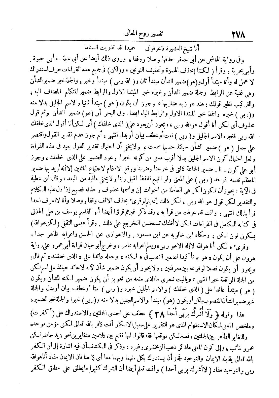 هذا وقوله ولا أشرك بربي أحدا 83 عطف على إحدى الجملتين والاستدراك على أكفرت وملخص المعنى لمكان الاستفهام الذي هو للتقرير على سبيل الإنكار أنت كافر بالله تعالى لكني مؤمن موحد