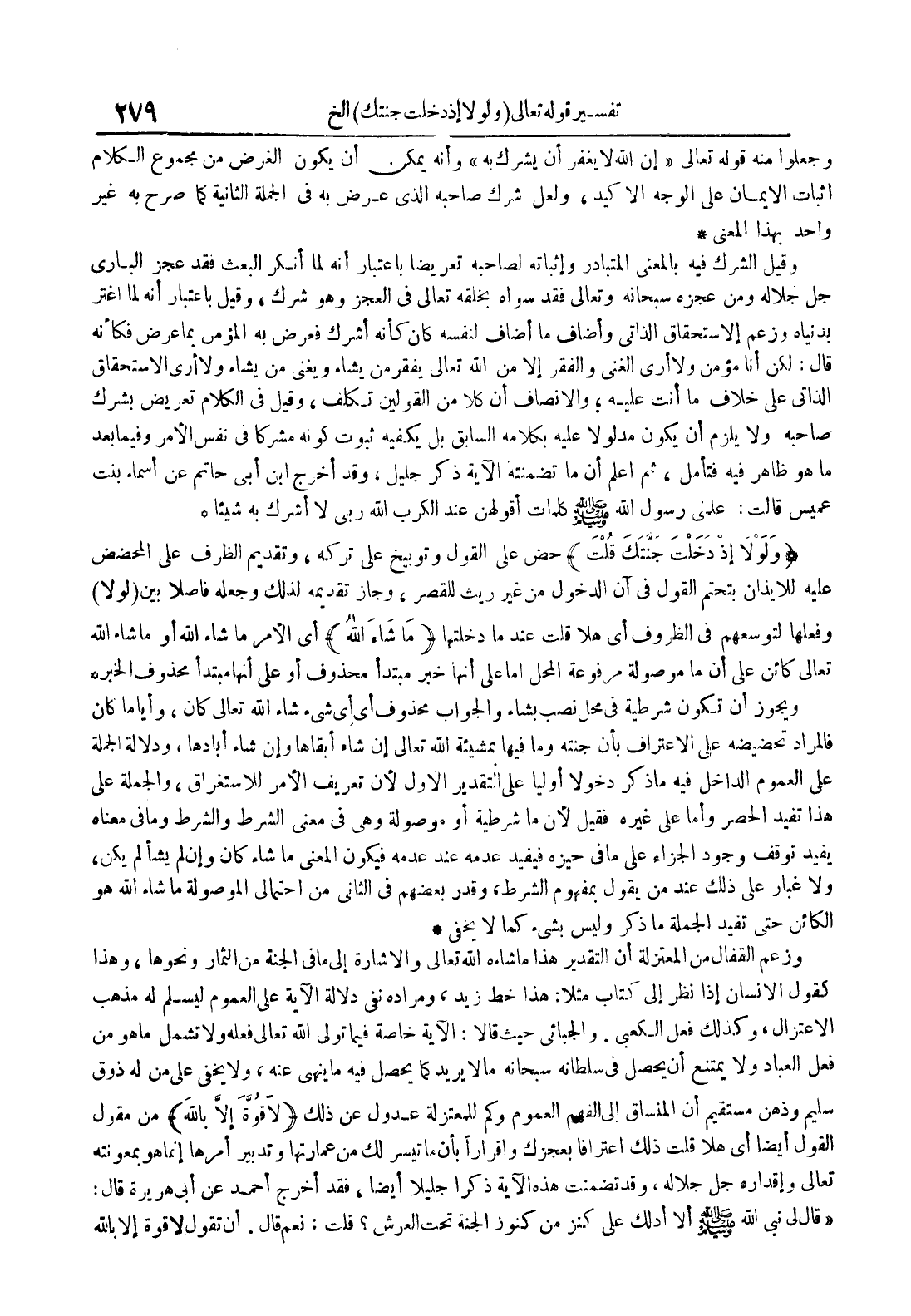 وزعم القفال من المعتزلة أن التقتير هذا ما شاء الله تعالى والإشارة إلى ما في الجنة من الثمار ونحوها وهذا كقول الإنسان إذا نظر إلى كتاب مثلا : هذا خط زيد ومراده نفي دلالة الآية على العموم ليسلم له مذهب الاعتزال وكذلك فعل الكعبي والجبائي حيث قالا : الآية خاصة فيما تولى الله تعالى فعله ولا تشمل ما هو من فعل العباد ولا يمتنع أن يحصل في سلطانه سبحانه ما لا يريد كما يحصل فيه ما ينهى عنه ولا يخفى على من له ذوق سليم وذهن مستقيم أن المنساق إلى الفهم العموم وكم للمعتزلة عدول عن ذلك لا قوة إلا بالله من مقول القول أيضا أي هلا قلت ذلك اعترافا بعجزك وإقرارا بأن ما تيسر لك من عمارتها وتدبير أمرها إنما هو بمعونته تعالى وإقداره جل جلاله وقد تضمنت هذه الآية ذكرا جليلا أيضا فقد أخرج أحمد عن أبي هريرة قال : قال لي نبي الله ألا أدلك على كنز من كنوز الجنة تحت العرش قلت : نعم قال : أن تقول لا قوة إلا بالله