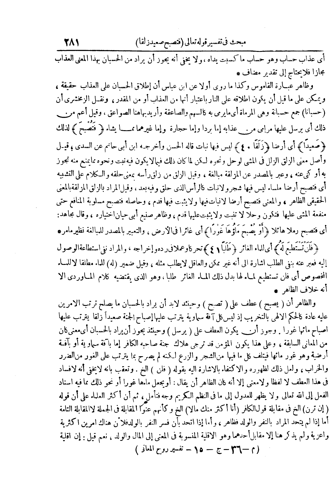 وظاهر عبارة القاموس وكذا ما روي أولا عن ابن عباس أن إطلاق الحسبان على العذاب حقيقة ويمكن على ما قيل أن يكون إطلاقه على النار باعتبار أنها من العذاب أو من المقدر ونقل الزمخشري أن حسبانا جمع حسبانة وهي المرماة أي ما يرمى به كالسهم والصاعقة وأريد بها هنا الصواعق وقيل أعم من ذلك أي يرسل عليها مرامي من عذابه إما بردا وإما حجارة وإما غيرهما مما يشاء فتصبح لذلك صعيدا أي أرضا زلقا 04 ليس فيها نبات قاله الحسن وأخرجه ابن أبي حاتم عن السدي وقيل وأصل معنى الزلق الزلل في المشي لوحل ونحوه لكن لما كان ذلك فيما لا يكون فيه نبت ونحوه مما يمنع منه تجوز به أو كني عنه وعبر بالمصدر عن المزلقة مبالغة وقيل الزلق من زلق رأسه بمعنى حلق حلقه والكلام على التشبيه أي فتصبح أرضا ملساء ليس فيها شجر ولا نبات كالرأس الذي حلق وفيه بعد وقيل المراد بالزلق المزلقة بالمعنى الحقيقي الظاهر والمعنى فتصبح أرضا لا نبات فيها ولا يثبت فيها قدم وحاصله فتصبح مسلوبة المنافع حتى منفعة المشي عليها فتكون وحلا لا تنبت ولا يثبت عليها قدم وظاهر صنيع أبي حيان اختياره وقال مجاهد : أي فتصبح رملا هائلا أو يصبح ماؤها غورا أي غائرا في الأرض والتعبير بالمصدر للمبالغة نظير ما مر