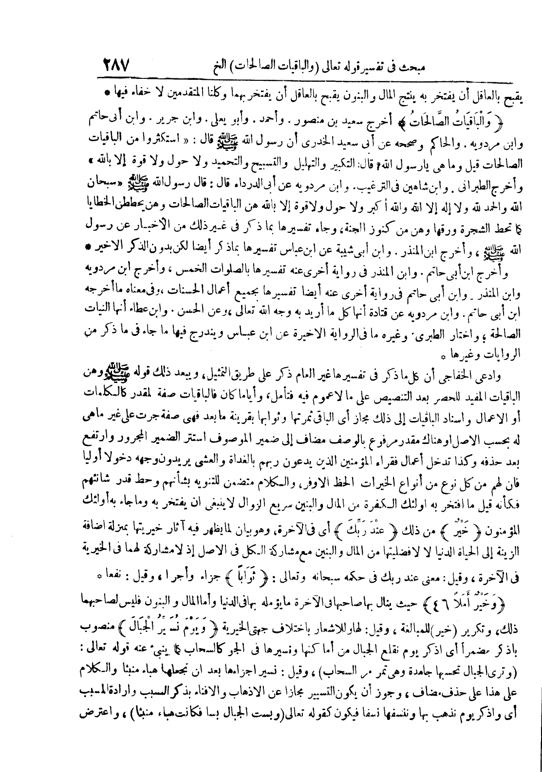 يقبح بالعاقل أن يفتخر به ينتج المال والبنون يقبح بالعاقل أن يفتخر بهما وكلتا المتقدمين لا خفاء فيها والباقيات الصالحات أخرج سعيد بن منصور وأحمد وأبو يعلى وابن جرير وابن أبي حاتم وابن مردويه والحاكم وصححه عن أبي سعيد الخدري أن رسول الله صلى الله عليه و سلم قال استكثروا من الباقيات الصالحات قيل وما هي يا رسول الله قال التكبير والتهليل والتسبيح والتحميد ولا حول ولا قوة إلا بالله وأخرج الطبراني وابن شاهين في الترغيب وابن مردويه عن أبي الدرداء قال قال رسول الله صلى الله عليه و سلم سبحان الله والحمد لله ولا إله إلا الله والله أكبر ولا حول ولا قوة إلا بالله هن الباقيات الصالحات وهن يحططن الخطايا كما تحط الشجرة ورقها وهن من كنوز الجنة وجاء تفسيرها بما ذكر في غير ذلك من الأخبار عن رسول الله صلى الله عليه و سلم وأخرج ابن المنذر وابن أبي شيبة عن ابن عباس تفسيرها بما ذكر أيضا لكن بدون الذكر الأخير