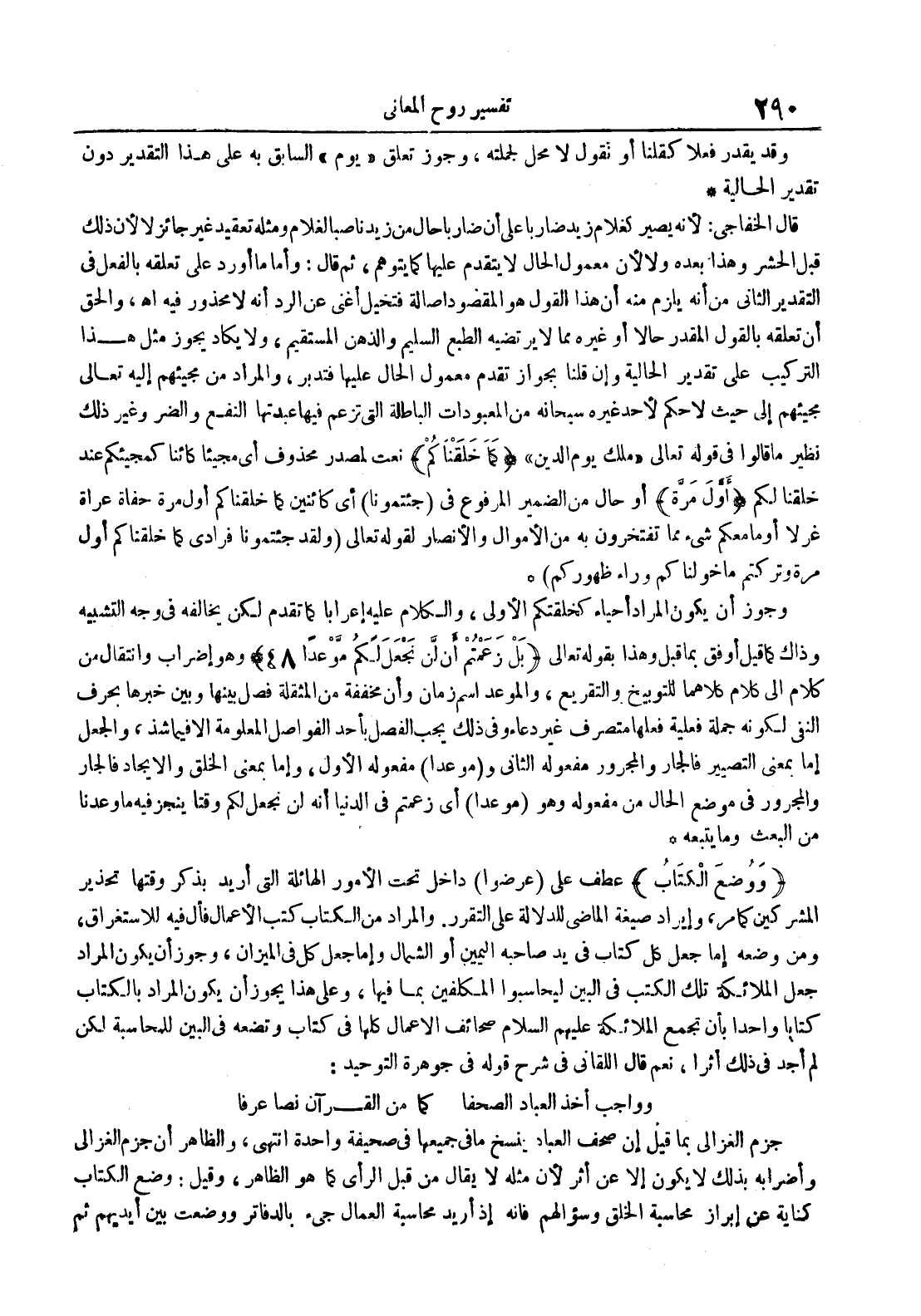 جزم الغزالي بما قيل إن صحف العباد ينسخ ما في جميعها في صحيفة واحدة انتهى والظاهر أن جزم الغزالي وأضرابه بذلك لا يكون إلا عن أثر لأن مثله لا يقال من قبل الرأي كما هو الظاهر وقيل وضع الكتاب كناية عن إبراز محاسبة الخلق وسؤالهم فإنه إذا أريد محاسبة العمال جيء بالدفاتر ووضعت بين أيديهم ثم