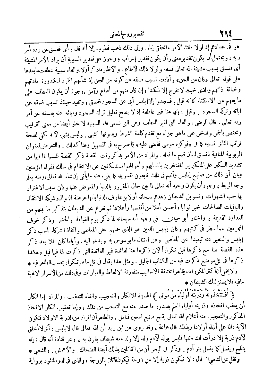 هو في عدادهم إذ لولا ذلك الأمر ما تحقق إباء وإلى ذلك ذهب قطرب إلا أنه قال : أي ففسق عن رده أمر ربه ويحتمل أن يكون تقدير معنى وأن يكون تدير إعراب وجوز على تقدير السببية أن يراد بالأمر المشيئة أي ففسق بسبب مشيئة الله تعالى فسقه ولولا ذلك لأطاع والأظهر ما ذكر أولا والفاء سببية عطفت ما بعدها على قوله تعالى كان من الجن وأفادت تسبب فسقه عن كونه من الجن إذ شأنهم التمرد لكدورة مادتهم وخباثة ذاتهم والذي خبث لا يخرج إلا نكدا وإن كان منهم من أطاع وآمن وجوز أن يكون العطف على ما يفهم من الاستثناء كأنه قيل : فسجدوا إلا إبليس أبى عن السجود ففسق وتفيد حينئذ تسبب فسقه عن إبائه وتركه السجود وقيل : إنها هنا غير عاطفة إذ لا يصح تعليل ترك السجود وإبائه عنه بفسقه عن أمر ربه تعالى قال الرضي : والفاء التي لغير العطف وهي التي تسمى فاء السببية لا تخلو أيضا من معنى الترتيب وتختص بالجمل وتدخل على ما هو جزاء مع تقدم كلمة الشرط وبدونها انتهى وليس بشيء لأنه يكفي لصحة ترتب الثاني تسببه كما في فوكزه موسى فقضى عليه كما صرح به في التسهيل وهنا كذلك والتعرض لعنوان الربوبية المنافية للفسق لبيان قبح ما فعله والمراد من الأمر بذكر وقت القصة ذكر القصة نفسها لما فيها من تشديد التنكير على المتكبرين المفتخرين بأنسابهم وأموالهم المستنكفين عن الإنتظام في سلك فقراء المؤمنين ببيان أن ذلك من ضليع إبليس وأنهم في ذلك تابعون لتسويله كما ينبيء عنه ما يأتي إن شاء الله تعالى ومنه يعلم وجه الربط وجوز أن يكون وجهه أنه تعالى لما بين حال المغرور بالدنيا والعرض عنها وكان سبب الاغترار بها حب الشهوات وتسويل الشيطان زهدهم سبحانه أول بزخارف الدنيا باتها عرض الزوال وشيكة الانتقال والباقيات الصالحات خير ثوابا وأحسن أملا من أنفسها وأعلاها ثم نفرهم عن الشيطان لتذكير ما بينهم من العداوة القديمة واختار أبو حيان في وجهه أنه سبحانه لما ذكر يوم القيامة والحشر وذكر خوف المجرمين مما سطر في كتبهم وكان إبليس اللعين هو الذي حملهم على المعاصي واتخاذ الشركاء ناسب ذكر إبليس وتنفير عنه تبعيدا عن المعاصي وعن امتثال ما يوسوس به ويدعو إليه وأياما كان فلا يعد ذكر هذه القصة عنا مع ذكرها قبل تكرارا لأن ذكرها هنا لفائد غير الفائدة التي ذكرت لها فيها قبل وهكذا ذكرها في كل موضع ذكرت فيه من الكتاب الجليل ومثل هذا يقال في كل ما هو تكرار بحسب الظاهر فيه