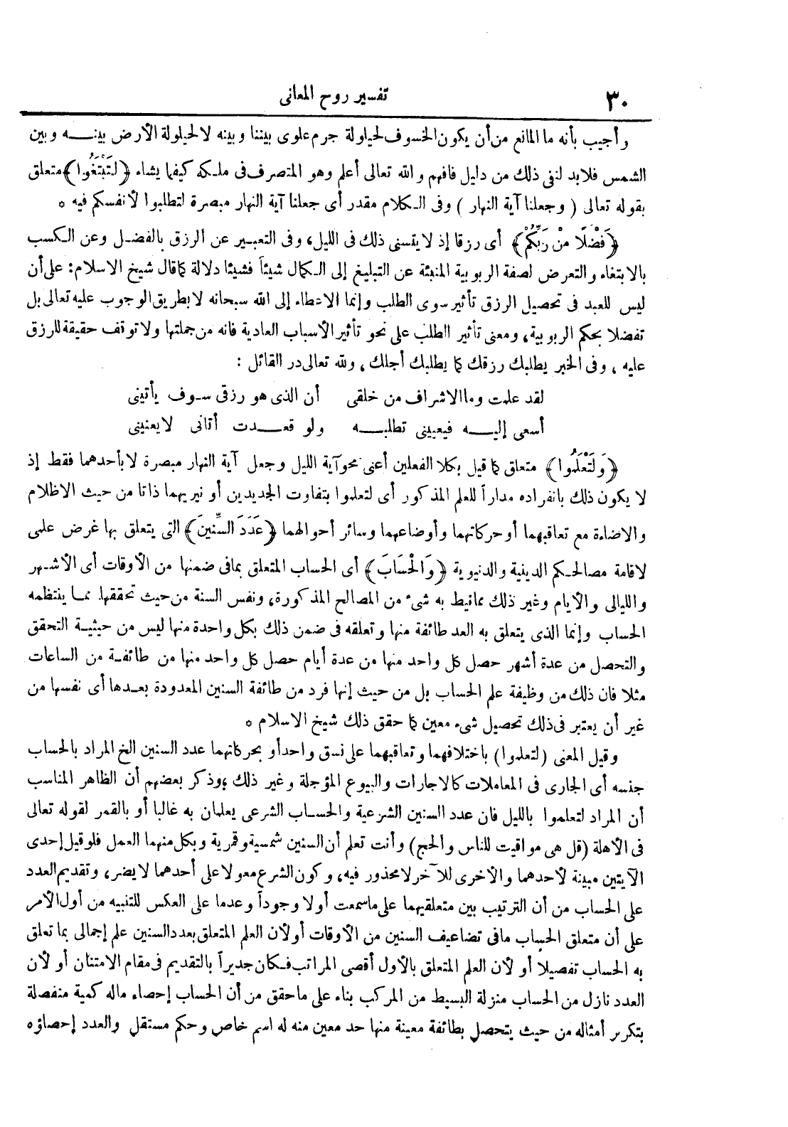 فضلا من ربكم أي رزقا إذ لا يتسنى ذلك في الليل وفي التعبير عن الرزق بالفضل وعن الكسب بالابتغاء والتعرض لصفة الربوبية المنبئة عن التبليغ إلى الكمال شيئا فشئيا دلالة كما قال شيخ الإسلام : على أن ليس للعبد في تحصيل الرزق تأثير سوى الطلب وإنما الاعطاء إلى الله سبحانه لا بطريق الوجوب عليه تعالى بل تفضلا بحكم الربوبية ومعنى تأثير الطلب على نحو تأثير الأسباب العادية فإنه من جملتها ولا توقف حقيقة للرزق عليه وفي الخبر يطلبك رزقك كما يطلبك أجلك ولله تعالى در القائل : لقد علمت وما الاشراف من خلقي أن الذي هو رزقي سوف يأتيني أسعى إليه فيعيبني تطلبه ولو قعدت أتاني لا يعنيني ولتعلموا متعلق كما قيل : كلا الفعلين أعني محو آية الليل وجعل آية النهار مبصرة لا بأحدهما فقط إذ لا يكون ذلك بانفراده مدادا للعلم المذكور أي لتعلموا بتفاوت الجديدين أو نيريهما ذاتا من حيث الاظلام والإضاءة مع تعاقبهما أو حركاتهما وأوضاعهما وسائر أحوالهما عدد السنين التي يتعلق بها غرض علمي لإقامة مصالحكم الدينية والدنيوية والحساب أي الحساب المتعلق بما في ضمنها من الأوقات أي الأشهر والليالي والأيام وغير ذلك مما نيط به شيء من المصالح المذكورة ونفس السنة من حيث تحققها بما ينتظمه الحساب وإنما الذي يتعلق به العد طائفة منها وتعلقه في ضمن ذلك بكل واحدة منها ليس من حيثية التحقق والتحصل من عدة أشهر حصل كل واحد منها من عدة أيام حصل كل واحد منها من طائفة من الساعات مثلا فإن ذلك من وظيفة علم الحساب بل من حيث إنها فرد من طائفة السنين المعدودة بعدها أي نفسها من غير أن يعتبر في ذلك تحصيل شيء معين كما حقق ذلك شيخ الإسلام