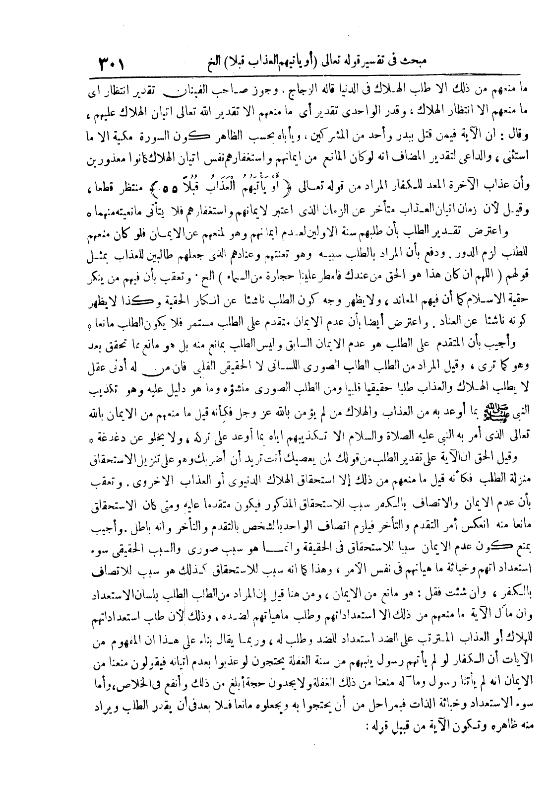 وأجيب بأن المتقدم على الطلب هو عدم الإيمان السابق وليس الطلب بمانع منه بل هو مانع مما تحقق بعد وهو كما ترى وقيل المراد من الطلب الطلب الصوري اللساني لا الحقيقي القلبي فإن من له أدنى عقل لا يطلب الهلاك والعذاب طلبا حقيقيا قلبيا ومن الطلب الصوري منشؤه وما هو دليل عليه وهو تكذيب النبي صلى الله عليه و سلم بما أوعد به من العذاب والهلاك من لم يؤمن بالله عز و جل فكأنه قيل ما منعهم من الإيمان بالله تعالى الذي أمر به النبي عليه الصلاة و السلام إلا تكذيبهم إياه بما أوعد على تركه ولا يخلو عن دغدغة