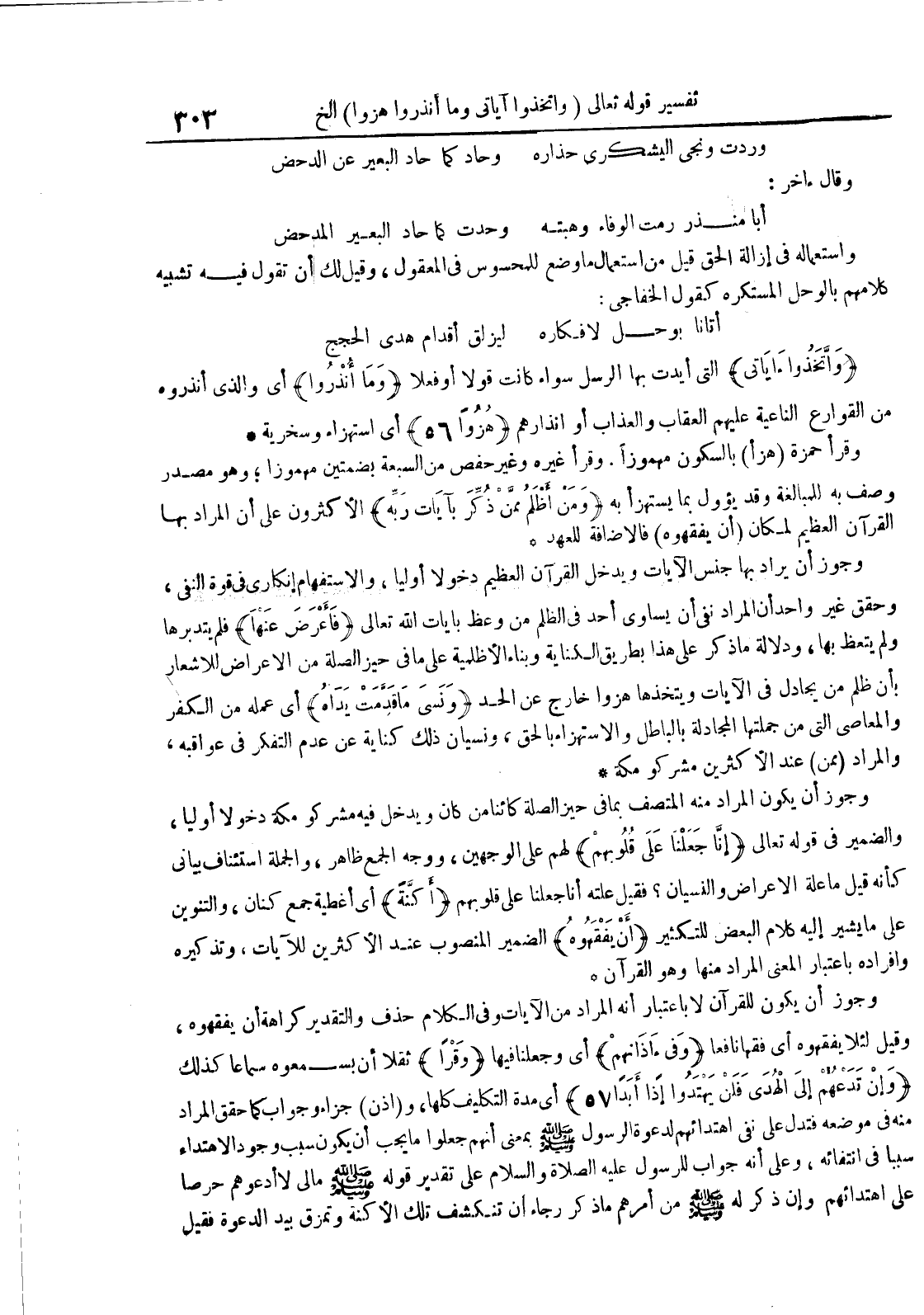 وردت ونجى اليشكري حذاره وحاد كما حاد البعير عن الدحض وقال آخر : أبا منذر رمت الوفاء وهبته وحدت كما حاد البعير المدحض مواستعماله في إزالة الحق قيل من استعمال ما وضع للمحسوس في المعقول وقيل لك أن تقول فيه تشبيه كلامهم بالوحل المستكره كقول الخفاجي : أتانا بوحل لأفكاره ليزلق أقدام هدى الحجج واتخذوا آياتي التي أيدت بها الرسل سواء كانت قولا أو فعلا وما أنذروا أي والذي أنذروه من القوارع الناعية عليهم العقاب والعذاب أو إنذارهم هزوا 65 أي استهزاء وسخرية