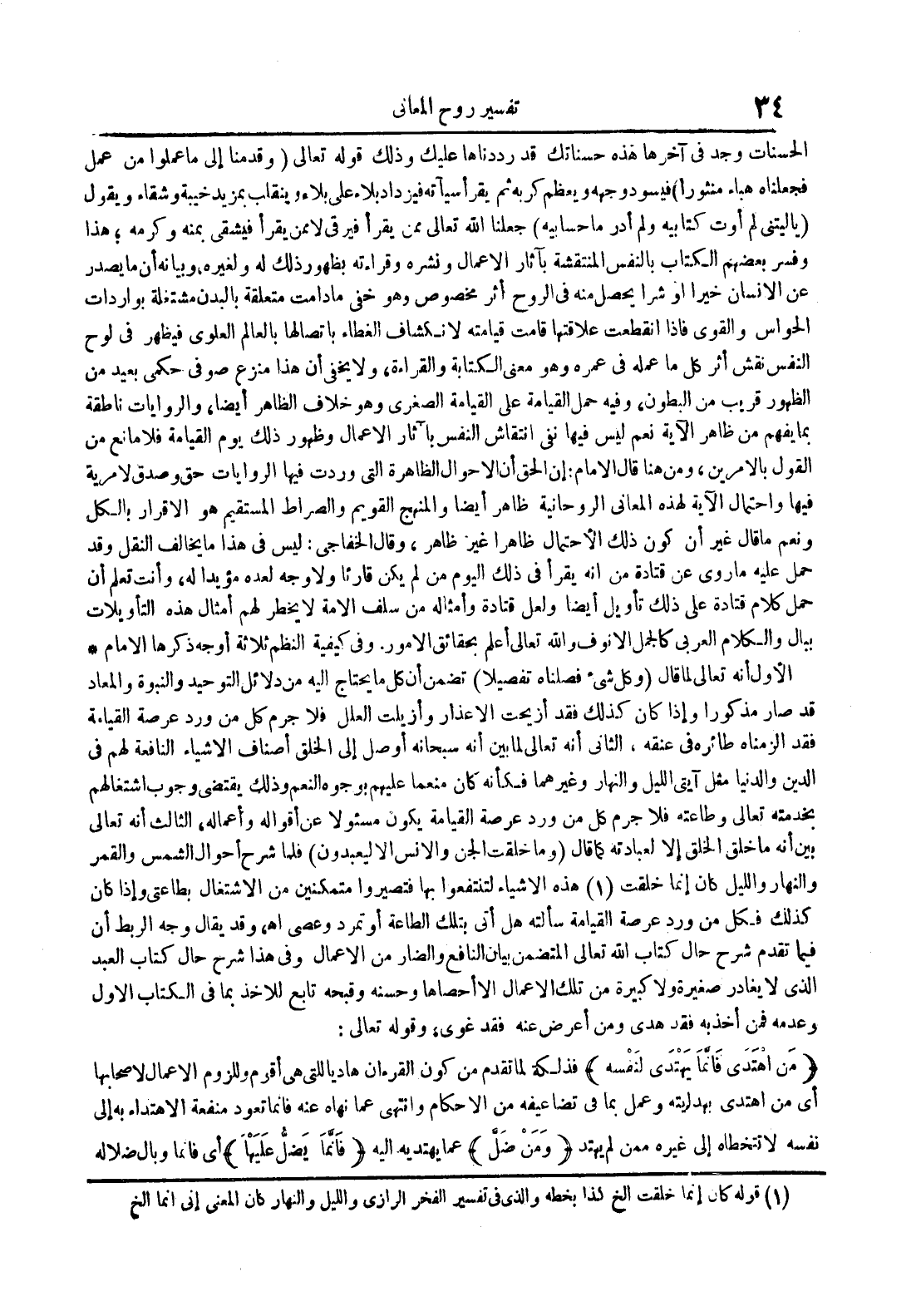 مالأول أنه تعالى لما قال وكل شيء فصلناه تفصيلا تضمن أن كل ما يحتاج إليه من دلائل التوحيد والنبوة والمعاد قد صار مذكورا وإذا كان كذلك فقد أزيحت الأعذار وأزيلت العلل فلا جرم كل من ورد عرصة القيامة فقد ألزمناه طائره في عنقه الثاني أنه تعالى لما بين أنه سبحانه أوصل إلى الخلق أصناف الأشياء النافعة لهم في الدين والدنيا مثل آيتي الليل والنهار وغيرهما فكأنه كان منعما عليهم بوجوه النعم وذلك يقتضي وجوب اشتغالهم بخدمته تعالى وطاعته فلا جرم كل من ورد عرصة القيامة يكون مسئولا عن أقواله وأعماله والثالث أنه تعالى بين أنه ما خلق الخلق إلا لعبادته كما قال وما خلقت الجن والإنس إلا ليعبدون فلما شرح أحوال الشمس والقمر والنهار والليل كان إنما خلقت هذه الأشياء لتنتفعوا بها فتصيروا متمكنين من الاشتغال بطاعتي وإذا كان كذلك فكل من ورد عرصة القيامة سألته هل أتى بتلك الطاعة أو تمرد وعصى ا ه وقد يقال وجه الربط أن فيما تقدم شرح حال كتاب الله تعالى المتضمن بيان النافع والضار من الأعمال وفي هذا شرح حال كتاب العبد الذي لا يغادر صغيرة ولا كبيرة من تلك الأعمال إلا أحصاها وحسنه وقبحه تابع للأخذ بما في الكتاب الأول وعدمه فمن أخذ به فقد هدي ومن أعرض عنه فقد غوى وقوله تعالى : من اهتدى فإنما يهتدي لنفسه فذلكة لما تقدم من كون القرءان هاديا للتي هي أقوم وللزوم الأعمال لأصحابها أي من اهتدى بهدايته وعمل بما في تضاعيفه من الأحكام وانتهى عما نهاه عنه فإنما تعود منفعة الاهتداء به إلى نفسه لا تتخطاه إلى غيره ممن لم يهتد ومن ضل عما يهتديه إليه فإنما يضل عليها أي فإنما وبال ضلاله
