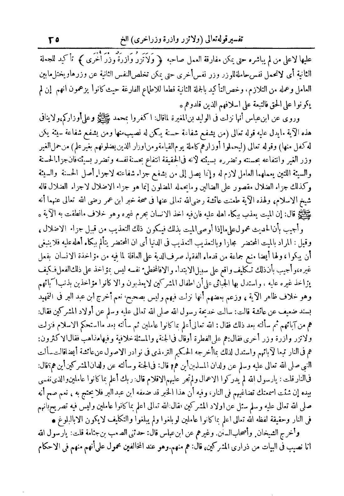 وأجيب بأن الحديث محمول على ما إذا أوصى الميت بذلك فيكون ذلك التعذيب من قبيل جزاء الإضلال وقيل : المراد بالميت المحتضر مجازا وبالتعذيب التعذيب في الدنيا أي أن المحتضر يتألم ببكاء أهله عليه فلا ينبغي أن يبكوا ولها أيضا منع جماعة من قدماء الفقهاء صرف الدية على العاقلة لما فيه من مؤاخذة الإنسان بفعل غيره وأجيب بأن ذلك تكليف واقع على سبيل الابتداء وإلا فالمخطيء نفسه ليس بمؤاخذ على ذلك الفعل فكيف يؤاخذ غيره عليه واستدل بها الجبائي على أن أطفال المشركين لا يعذبون وإلا كانوا مؤاخذين بذنب آبائهم وهو خلاف ظاهر الآية وزعم بعضهم أنها نزلت فيهم وليس بصحيح نعم أخرج ابن عبد البر في التمهيد بسند ضعيف عن عائشة قالت : سألت خديجة رسول الله عن أولاد المشركين فقال : هم من آبائهم ثم سألته بعد ذلك فقال : الله تعالى أعلم بما كانوا عاملين ثم سألته بعد ما استحكم الإسلام فنزلت ولا تزر وازرة وزر أخرى فقال : هم على الفطرة أو قال في الجنة والمسئلة خلافية وفيها مذاهب فقال الأكثرون : هم في النار تبعا لآبائهم واستدل لذلك بما أخرجه الحكيم الترمذي في نوادر الأصول عن عائشة أيضا قالت سألت النبي عن ولدان المسلمين أين هم قال : في الجنة وسألته عن ولدان المشركين أين هم قال : في النار قلت : يا رسول الله لم يدركوا الأعمال ولم تجر عليهم الأقلام قال : ربك أعلم بما كانوا عاملين والذي نفسي بيده إن شئت أسمعتك تضاغيهم في النار وفيه أن هذا الخبر قد ضعفه ابن عبد البر فلا يحتج به نعم صح أنه سئل عن أولاد المشركين فقال : الله تعالى أعلم بما كانوا عاملين وليس فيه تصريح بأنهم في النار وحقيقة لفظه الله تعالى أعلم بما كانوا عاملين لو بلغوا ولم يبلغوا والتكليف لا يكون إلا بالبلوغ