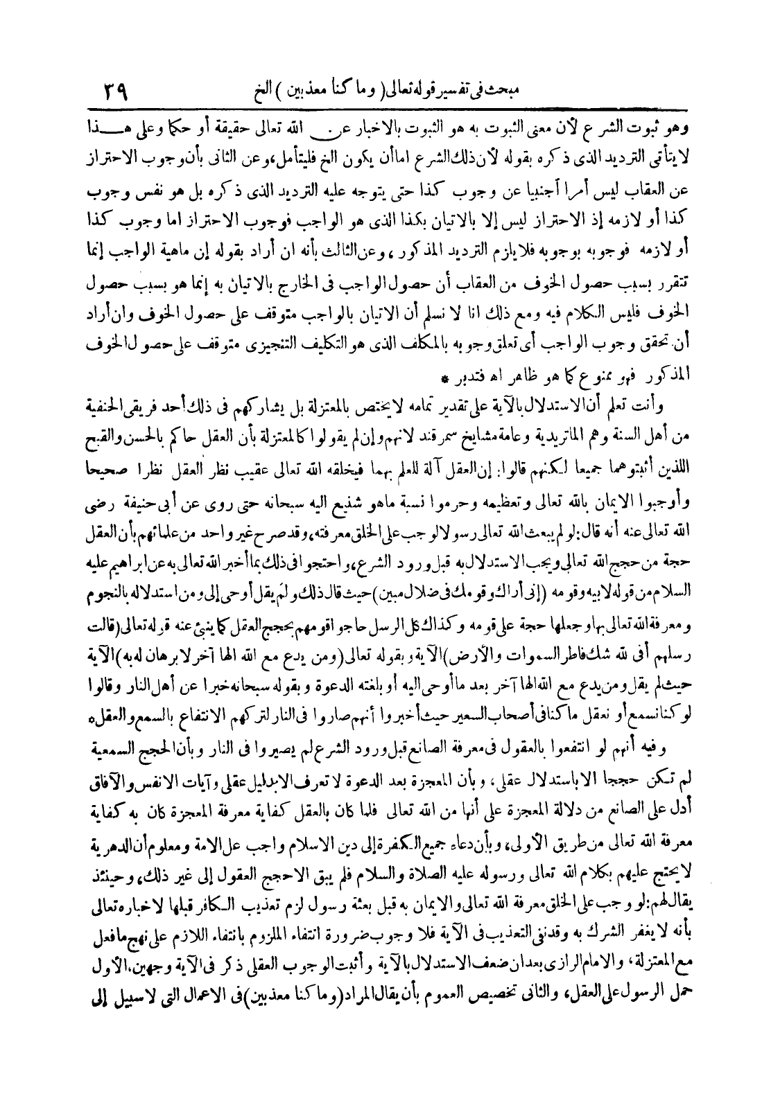 وأنت تعلم بأن الاستدلال بالآية على تقدير تمامه لا يختص بالمعتزلة بل يشاركهم في ذلك أحد فريقي الحنفية من أهل السنة وهم الماتريدية وعامة مشايخ سمرقند لأنهم وإن لم يقولوا كالمعتزلة بأن العقل حاكم بالحسن والقبح اللذين أثبتوهما جميعا لكنهم قالوا : إن العقل آلة للعلم بهما فيخلقه الله تعالى عقيب نظر العقل نظرا صحيحا وأوجبوا الإيمان بالله تعالى وتعظيمه وحرموا نسبة ما هو شنيع إليه سبحانه حتى روي عن أبي حنيفة رضي الله تعالى عنه أنه قال : لو لم يبعث الله تعالى رسولا لوجب على الخلق معرفته وقد صرح غير واحد من علمائهم بأن العقل حجة من حجج الله تعالى ويجب الاستدلال به قبل ورود الشرع واحتجوا في ذلك بما أخبر الله تعالى به عن إبراهيم عليه السلام من قوله لأبيه وقومه إني أراك وقومك في ضلال مبين حيث قال ذلك ولم يقل أوحي إلي من استدلاله بالنجوم ومعرفة الله تعالى بها وجعلها حجة على قومه وكذلك كل الرسل حاجوا قومهم بحجج العقل كما ينبيء عنه قوله تعالى قالت رسلهم أفي الله شك فاطر السموات والأرض الآية وبقوله تعالى ومن يدع مع الله إلها آخر لا برهان له به الآية حيث لم يقل ومن يدع مع الله إلها آخر بعد ما أوحي إليه أو بلغته الدعوة وبقوله سبحانه خبرا عن أهل النار وقالوا لو كنا نسمع أو نعقل ما كنا في أصحاب السعير حيث أخبروا أنهم صاروا في النار لتركهم الانتفاع بالسمع والعقل