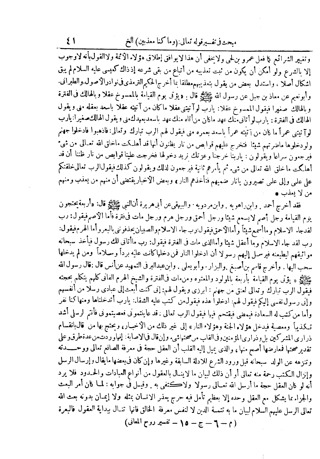 وتغيير الشرائع كما فعل عمرو ابن لحي ولا يخفى أن هذا لا يوافق إطلاق هؤلاء الأئمة ولا القول بأنه لا وجوب إلا بالشرع ولو أمكن أن يكون من ثبت تعذيبه من اتباع من بقي شرعه إذ ذاك كعيسى عليه السلام ولم يبق إشكال أصلا واستدل بعض من يقول بتعذيبهم مطلقا بما أخرج الحكيم الترمذي في نوادر الأصول والطبراني وأبو نعيم عن معاذ بن جبل عن رسول الله قال : يؤتى يوم القيامة بالممسوخ عقلا وبالهالك في الفترة وبالهالك صغيرا فيقول الممسوخ عقلا : يا رب لو آتيتني عقلا ما كان من آتيته عقلا بأسعد بعقله مني ويقول الهالك في الفترة : يا رب لو أتاني منك عهد ما كان من أتاه منك عهد بأسعد بعهدك مني ويقول الهالك صغيرا : يا رب لو آتيتني عمرا ما كان من آتيته عمرا بأسعد بعمره مني فيقول لهم الرب تبارك وتعالى : فاذهبوا فادخلوا جهنم ولو دخلوها ما ضرتهم شيئا فتخرج عليهم قوابص من نار يظنون أنها قد أهلكت ما خلق الله تعالى من شيء فيرجعون سراعا ويقولون : يا ربنا خرجنا وعزتك نريد دخولها فخرجت علينا قوابص من نار ظننا أن قد أهلكت ما خلق الله تعالى من شيء ثم يأمرهم ثانية فيرجعون لذلك ويقولون كذلك فيقول الرب تعالى خلقتكم على علمي وإلى علمي تصيرون يا نار ضميهم فتأخذهم النار وبعض الأخبار يقتضي أن منهم من يعذب ومنهم من لا يعذب