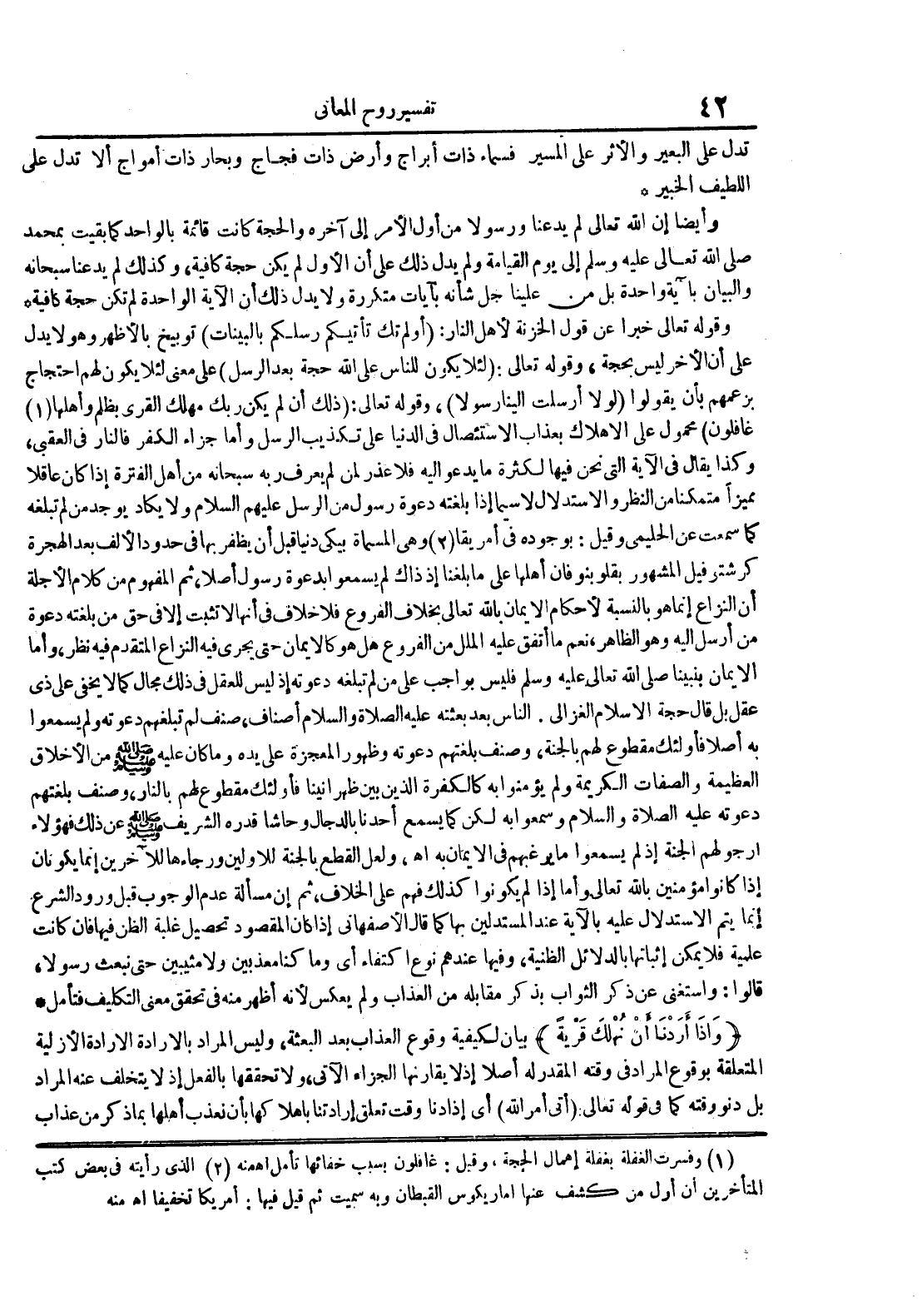 وقوله تعالى خبرا عن قول الخزنة لأهل النار : أو لم تك تأتيكم رسلكم بالبينات توبيخ بالأظهر وهو لا يدل على أن الأخر ليس بحجة وقوله تعالى : لئلا يكون للناس على الله حجة بعد الرسل على معنى لئلا يكون لهم احتجاج بزعمهم بأن يقولوا لولا أرسلت إلينا رسولا وقوله تعالى : ذلك أن لم يكن ربك مهلك القرى وأهلها غافلون محمول على الإهلاك بعذاب الاستئصال في الدنيا على تكذيب الرسل وأما جزاء الكفر فالنار في العقبى وكذا يقال في الآية التي نحن فيها لكثرة ما يدعو إليه فلا عذر لمن لم يعرف ربه سبحانه من أهل الفترة إذا كان عاقلا مميزا متمكنا من النظر والاستدلال لا سيما إذا بلغته دعوة رسول من الرسل عليهم السلام ولا يكاد يوجد من لم تبلغه كما سمعت عن الحليمي وقيل : بوجوده في أمريقا وهي المسماة بيكي دنيا قبل أن يظفر بها في حدود الألف بعد الهجرة كرشتوفيل المشهور بقلوبنو فإن أهلها على ما بلغنا إذ ذاك لم يسمعوا بدعوة رسول أصلا ثم المفهوم من كلام الأجلة أن النزاع إنما هو بالنسبة لأحكام الإيمان بالله تعالى بخلاف الفروع فلا خلاف في أنها لا تثبت إلا في حق من بلغته دعوة من أرسل إليه وهو الظاهر نعم ما اتفق عليه الملل من الفروع هل هو كالإيمان حتى يجري فيه النزاع المتقدم فيه نظر وأما الإيمان بنبينا فليس بواجب على من لم تبلغه دعوته إذ ليس للعقل في ذلك مجال كما لا يخفى على ذي عقل بل قال حجة الإسلام الغزالي الناس بعد بعثته عليه الصلاة و السلام أصناف صنف لم تبلغهم دعوته ولم يسمعوا به أصلا فأولئك مقطوع لهم بالجنة وصنف بلغتهم دعوته وظهور المعجزة على يده وما كان عليه من الأخلاق العظيمة والصفات الكريمة ولم يؤمنوا به كالكفرة الذين بين ظهرانينا فأولئك مقطوع لهم بالنار وصنف بلغتهم دعوته عليه الصلاة و السلام وسمعوا به لكن كما يسمع أحدنا بالدجال وحاشا قدره الشريف على ذلك فهؤلاء أرجو لهم الجنة إذ لم يسمعوا ما يرغبهم في الإيمان به ا ه ولعل القطع بالجنة للأولين ورجاءها للآخرين إنما يكونان إذا كانوا مؤمنين بالله تعالى وأما إذا لم يكونوا كذلك فهم على الخلاف ثم إن مسألة عدم الوجوب قبل ورود الشرع إنما يتم الاستدلال عليه بالآية عند المستدلين بها كما قال الأصفهاني إذا كان المقصود تحصيل غلبة الظن فيها فإن كانت علمية فلا يمكن إثباتها بالدلائل الظنية وفيها عندهم نوع اكتفاء أي وما كنا معذبين ولا مثيبين حتى نبعث رسولا قالوا : واستغني عن ذكر الثواب بذكر مقابله من العذاب ولم يعكس لأنه أظهر منه في تحقق معنى التكليف فتأمل