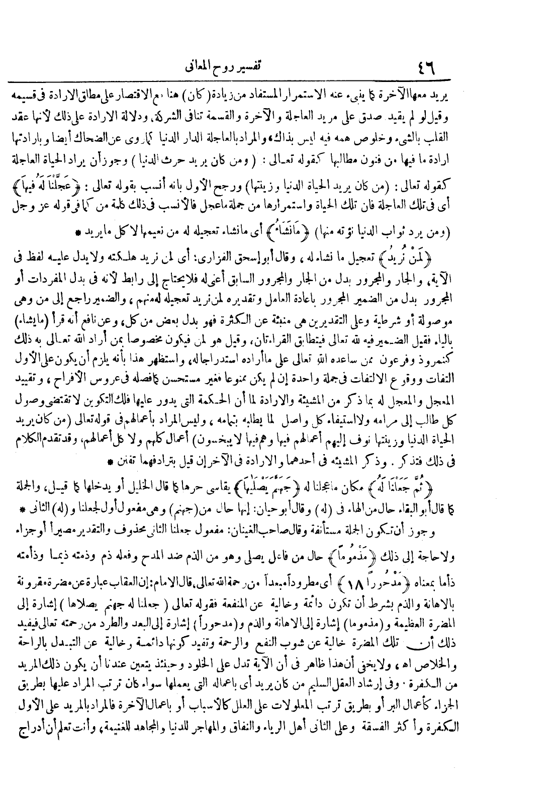 وجوز أن تكون الجملة مستأنفة وقال صاحب الغينان : مفعول جعلنا الثاني محذوف والتقدير مصيرا أو جزاء ولا حاجة إلى ذلك مذموما حال من فاعل يصلى وهو من الذم ضد المدح وفعله ذم وذمته ذيما ودأمته دأما بمعناه مدحورا 81 أي مطرودا مبعدا من رحمة الله تعالى قال الإمام : إن العقاب عبارة عن مضرة مقرونة بالإهانة والذم بشرط أن تكون دائمة وخالية عن المنفعة فقوله تعالى جعلنا له جهنم يصلاها إشارة إلى البعد والطرد من رحمته تعالى فيفيد ذلك أن تلك المضرة خالية عن شوب النفع والرحمة وتفيد كونها دائمة وخالية عن التبدل بالراحة والخلاص ا ه ولا يخفى أن هذا ظاهر في أن الآية تدل على الخلود وحينئذ يتعين عندنا أن يكون ذلك المريد من الكفرة وفي إرشاد العقل السليم من كان يريد أي بأعماله التي يعملها سواء كان ترتب المراد عليها بطريق الجزاء كأعمال البر أو بطريق ترتب المعلولات على العلل كالأسباب أو بأعمال الآخرة فالمراد بالمريد على الأول الكفرة وأكثر الفسقة وعلى الثاني أهل الرياء والنفاق والمهاجر للدنيا والمجاهد للغنيمة وأنت تعلم أن إدراج
