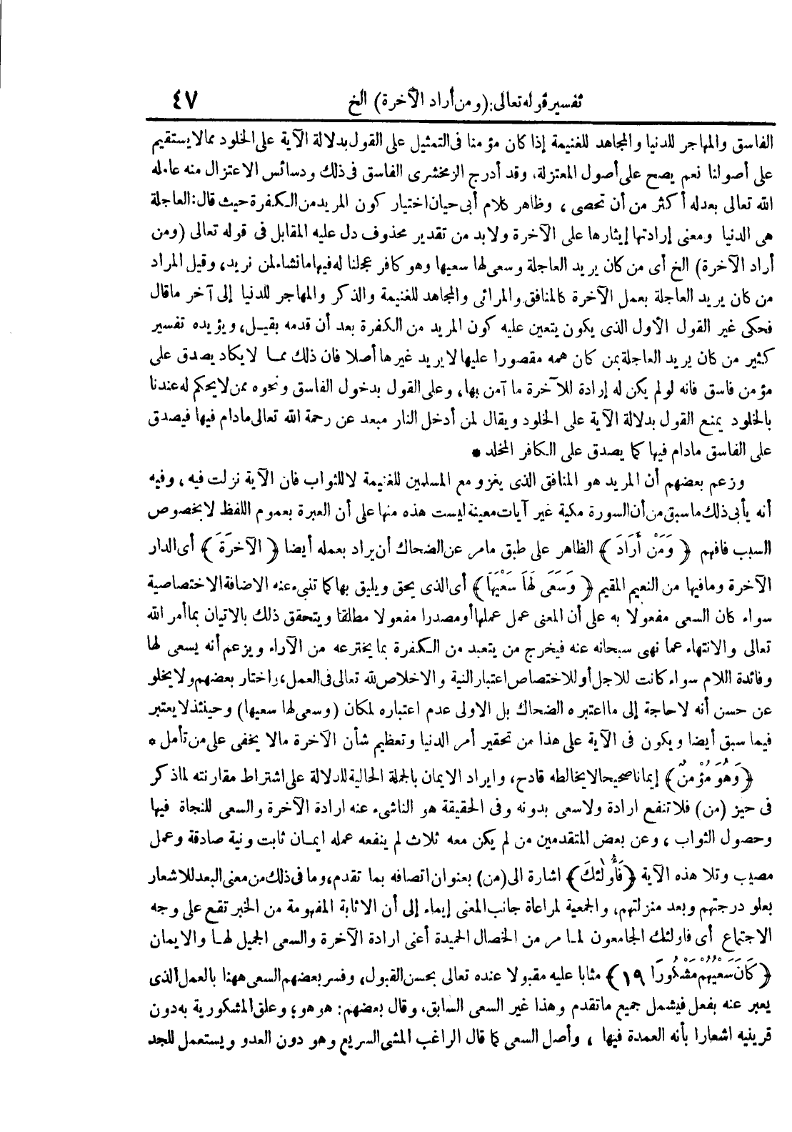 وهو مؤمن إيمانا صحيحا لا يخالطه قادح وإيراد الإيمان بالجملة الحالية للدلالة على اشتراط مقارنته لما ذكر في حيز من فلا تنفع إرادة ولا سعي بدونه وفي الحقيقة هو الناشيء عنه إرادة الآخرة والسعي للنجاة فيها وحصول الثواب وعن بعض المتقدمين من لم يكن معه ثلاث لم ينفعه عمله إيمان ثابت ونية صادقة وعمل مصيب وتلا هذه الآية فأولئك إشارة إلى من بعنوان اتصافه بما تقدم وما في ذلك من معنى البعد للإشعار بعلو درجتهم وبعد منزلتهم والجمعية لمراعاة جانب المعنى إيماء إلى الإثابة المفهومة من الخبر تقع على وجه الاجتماع أي فأولئك الجامعون لما مر من الخصال الحميدة أعني إرادة الآخرة والسعي الجميل لها والإيمان كان سعيهم مشكورا 91 مثابا عليه مقبولا عنده تعالى بحسن القبول وفسر بعضهم السعي ههنا بالعمل الذي يعبر عنه بفعل فيشمل جميع ما تقدم وهذا غير السعي السابق وقال بعضهم : هو هو وعلق المشكورية به دون قرينيه إشعارا بأنه العمدة فيها وأصل السعي كما قال الراغب المشي السريع وهو دون العدو ويستعمل للجد
