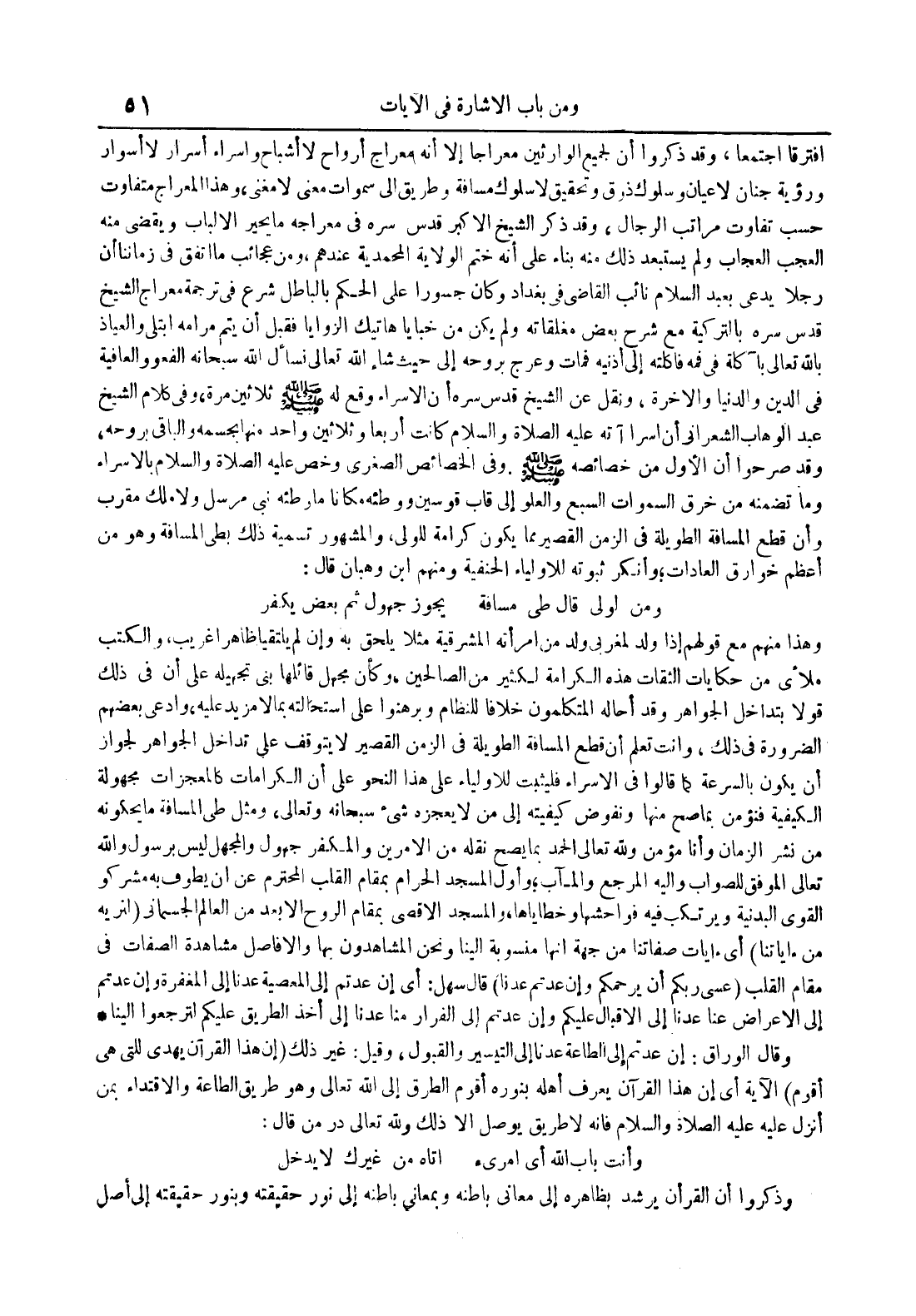 افترقا اجتمعا وقد ذكروا أن لجميع الوارثين معراجا إلا أنه معراج أرواح لا أشباح وإسراء أسرار لا أسوار ورؤية جنان لا عيان وسلوك ذوق وتحقيق لا سلوك مسافة وطريق إلى سموات معنى لا مغنى وهذا المعراج متفاوت حسب تفاوت مراتب الرجال وقد ذكر الشيخ الأكبر قدس الله سره في معراجه ما يحير الألباب ويقضي منه العجب العجاب ولم يستبعد ذلك منه بناء على أنه ختم الولاية المحمدية عندهم ومن عجائب ما اتفق في زماننا أن رجلا يدعى بعبد السلام نائب القاضي في بغداد وكان جسورا على الحكم بالباطل شرع في ترجمة معراج الشيخ قدس الله سره بالتركية مع شرح بعض مغلقاته ولم يكن من خبايا هاتيك الزوايا فقبل أن يتم مرامه ابتلي والعياذ بالله تعالى بآكلة في فمه فأكلته إلى أذنيه فمات وعرج بروحه إلى حيث شاء الله تعالى نسأل الله سبحانه العفو والعافية في الدين والدنيا والآخرة ونقل عن الشيخ قدس سره أن الإسراء وقع له ثلاثين مرة وفي كلام الشيخ عبد الوهاب الشعراني أن أسراآته عليه الصلاة و السلام كانت أربعا وثلاثين واحد منها بجسمه والباقي بروحه وقد صرحوا أن الأول من خصائصه وفي الخصائص الصغرى وخص عليه الصلاة و السلام بالإسراء وما تضمنه من خرق السموات السبع والعلو إلى قاب قوسين ووطئه مكانا ما وطئه نبي مرسل ولا ملك مقرب وأن قطع المسافة الطويلة في الزمن القصير مما يكون كرامة للولي والمشهور تسمية ذلك بطي المسافة وهو من أعظم خوارق العادات وأنكر ثبوته للأولياء الحنفية ومنهم ابن وهبان قال : ومن لولي قال طي مسافة يجوز جهول ثم بعض يكفر وهذا منهم مع قولهم إذا ولد من امرأته المشرقية مثلا يلحق به وإن لم يلتقيا ظاهرا غريب والكتب ملأى من حكايات الثقات هذه الكرامة لكثير من الصالحين وكأن مجهل قائلها بني تجهيله على أن في ذلك قولا بتداخل الجواهر وقد أحاله المتكلمون خلافا للنظام وبرهنوا على استحالته بما لا مزيد عليه وادعى بعضهم الضرورة في ذلك وأنت تعلم أن قطع المسافة الطويلة في الزمن القصير لا يتوقف على تداخل الجواهر لجواز أن يكون بالسرعة كما قالوا في الإسراء فليثبت للأولياء على هذا النحو على أن الكرامات كالمعجزات مجهولة الكيفية فنؤمن بما صح منها ونفوض كيفيته إلى من لا يعجزه شيء سبحانه وتعالى ومثل طي المسافة ما يحكونه من نشر الزمان وأنا مؤمن ولله تعالى الحمد بما يصح نقله من الأمرين والمكفر جهول والمجهل ليس برسول والله تعالى الموفق للصواب وإليه المرجع والمآب وأول المسجد الحرام بمقام القلب المحترم عن أن يطوف مشركو القوى البدنية ويرتكب فيه فواحشها وخطاياها والمسجد الأقصى بمقام الروح الأبعد من العالم الجسماني لنريه من ءاياتنا أي ءايت صفاتنا من جهة أنها منسوبة إلينا ونحن المشاهدون بها والأفاصل مشاهدة الصفات في مقام القلب عسى ربكم أن يرحمكم وإن عدتم عدنا قال سهل : أي إن عدتم إلى المعصية عدنا إلى المغفرة وإن عدتم إلى الإعراض عنا عدنا إلى الإقبال عليكم وإن عدتم إلى الفرار منا عدنا إلى أخذ الطريق عليكم لترجعوا إلينا