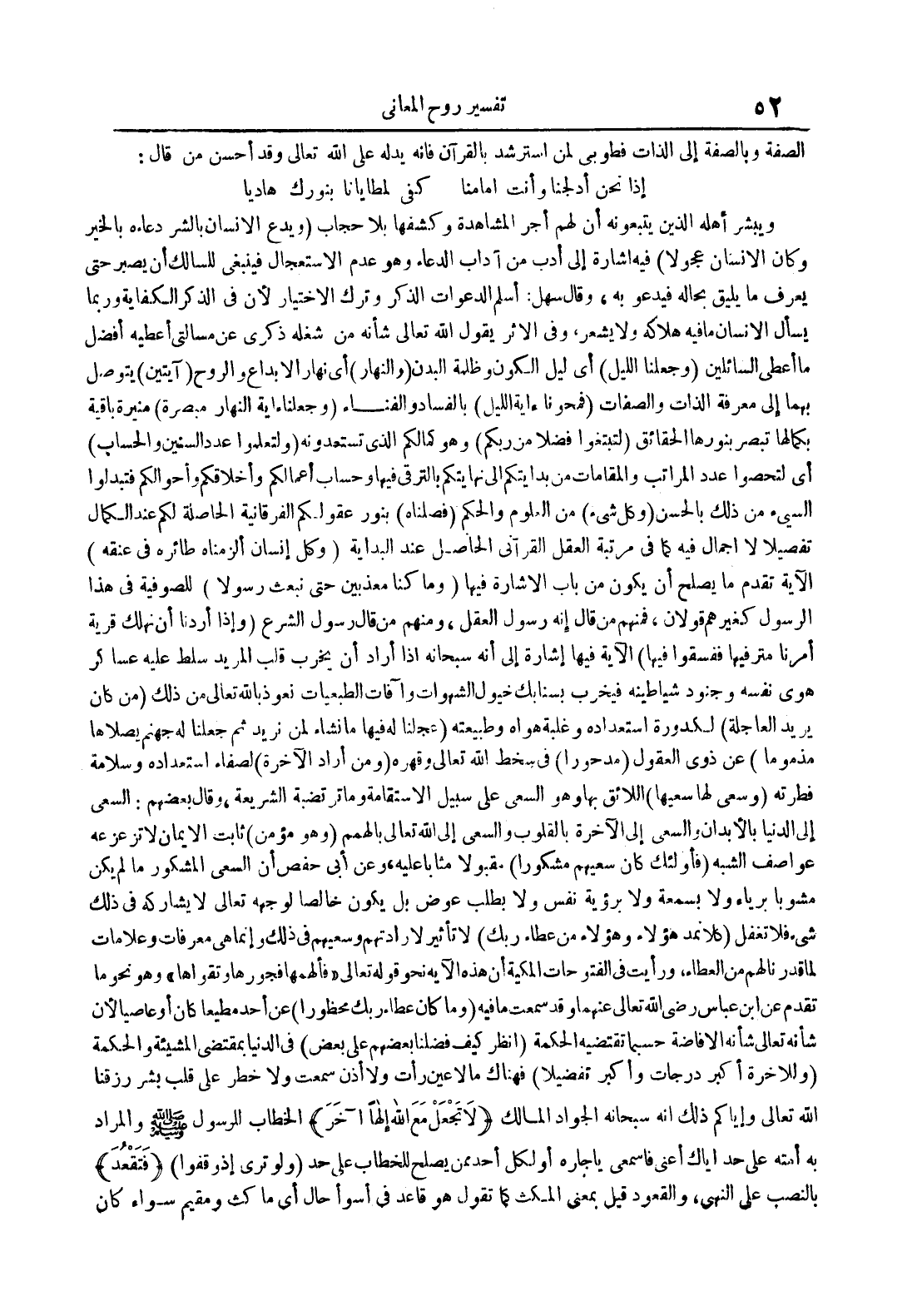 الصفة وبالصفة إلى الذات فطوبى لمن استرشد بالقرآن فإنه يدله على الله تعالى وقد أحسن من قال : إذا نحن أدلجنا وأنت أمامنا كفى لمطايانا بنورك هاديا ويبشر أهله الذين يتبعونه أن لهم أجر المشاهدة وكشفها بلا حجاب ويدع الإنسان بالشر دعاءه بالخير وكان الإنسان عجولا فيه إشارة إلى أدب من آداب الدعاء وهو عدم الاستعجال فينبغي للسالك أن يصبر حتى يعرف ما يليق بحاله فيدعو به وقال سهل : أسلم الدعوات الذكر وترك الاختيار لأن في الذكر الكفاية وربما يسأل الإنسان ما فيه هلاكه ولا يشعر وفي الأثر يقول الله تعالى شأنه من شغله ذكري عن مسألته أعطيته أفضل ما أعطي السائلين وجعلنا الليل أي ليل السكون وظلمة البدن والنهار أي نهار الإبداع والروح آيتين يتوصل بهما إلى معرفة الذات والصفات فمحونا ءاية الليل بالفساد والفناء وجعلنا ءاية النهار مبصرة منيرة باقية بكمالها تبصر بنورها الحقائق لتبتغوا فضلا من ربكم وهو كمالكم الذي تستعدونه ولتعلموا عدد السنين والحساب أي لتحصوا عدد المراتب والمقامات من بدايتكم إلى نهايتكم بالترقي فيها وحساب أعمالكم وأخلاقكم وأحوالكم فتبدلوا السيء من ذلك بالحسن وكل شيء من العلوم والحكمة فصلناه بنور عقولكم الفرقانية الحاصلة لكم عند الكمال تفصيلا لا إجمال فيه كما في مرتبة العقل القرآني الحاصل عند البداية وكل إنسان ألرمناه طائره في عنقه الآية تقدم ما يصلح أن يكون من باب الإشارة فيها وما كنا معذبين حتى نبعث رسولا للصوفية في هذا الرسول كغيرهم قولان فمنهم من قال إنه رسول العقل ومنهم من قال رسول الشرع وإذا أردنا أن نهلك قرية أمرنا مترفيها ففسقوا فيها الآية إشارة إلى أنه سبحانه إذا أراد أن يخرب قلب المريد سلط عليه عساكر هوى نفسه وجنوده وشياطينه فيخرب بسنابك خيول الشهوات وآفات الطبعيات نعوذ بالله تعالى من ذلك من كان يريد العاجلة لكدورة استعداده وغلبة هواه وطبيعته عجلنا له فيها ما نشاء لمن نريد ثم جعلنا له جهنم يصلاها مذموما عن ذوي العقول مدحورا في سخط الله تعالى وقهره ومن أراد الآخرة لصفاء استعداده وسلامة فطرته وسعى لها سعيها اللائق بها وهو السعي على سبيل الاستقامة وما ترتضيه الشريعة وقال بعضهم : السعي إلى الدنيا بالأبدان والسعي إلى الآخرة بالقلوب والسعي إلى الله تعالى بالهمم وهو مؤمن ثابت الإيمان لا تزعزعه عواصف الشبه فأولئك كان سعيهم مشكورا مقبولا مثابا عليه وعن أبي حفص أن السعي المشكور ما لم يكم مشوبا برياء ولا بسمعة ولا برؤية نفس ولا بطلب عوض بل يكون خالصا لوجهه تعالى لا يشاركه في ذلك شيء فلا تغفل كلا نمد هؤلاء وهؤلاء من عطاء ربك لا تأثير لارادتهم وسعيهم في ذلك وإنما هي معرفات وعلامات لما قدرنا لهم من العطاء ورأيت في الفتوحات المكية أن هذه الآية نحو قوله تعالى فألهمها فجورها وتقواها وهو نحو ما تقدم عن ابن عباس رضي الله تعالى عنهما وقد سمعت ما فيه وما كان عطاء ربك محظورا عن أحد مطيعا كان أو عاصيا لأن شأنه تعالى شأنه الإفاضة حسبما تقتضيه الحكمة انظر كيف فضلنا بعضهم على بعض في الدنيا بمقتضى المشيئة والحكمة وللآخرة أكبر درجات وأكبر تفضيلا فهناك ما لا عين رأت ولا أذن سمعت ولا خطر على قلب بشر رزقنا الله تعالى وإياكم ذلك إنه سبحانه الجواد المالك لا تجعل مع الله إلها آخر الخطاب للرسول والمراد به أمته على حد إياك أعني فاسمعي يا جاره أو لكل أحد ممن يصلح للخطاب على حد ولو ترى إذ وقفوا فتقعد بالنصب على النهي والقعود قيل بمعنى المكث كما تقول هو قاعد في أسوأ حال أي ماكث ومقيم سواء كان
