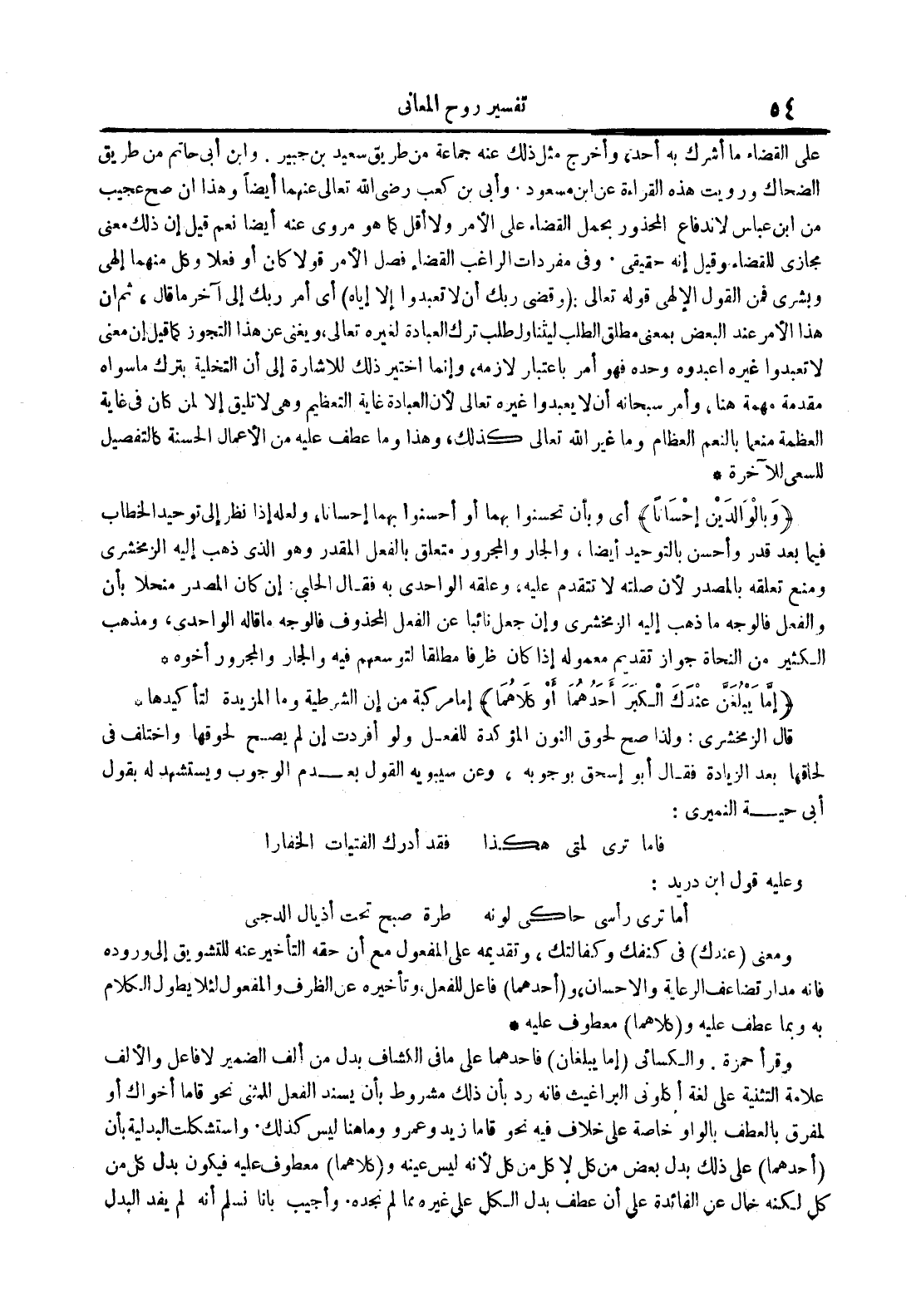 وقرأ حمزة والكسائي إما يبلغان فأحدهما على ما في الكشاف بدل من ألف الضمير لا فاعل والألف علامة التثنية على لغة أكلوني البراغيث فإنه رد بأن ذلك مشروط بأن يسند الفعل المثنى نحو قاما أخواك أو لمفرق بالعطف بالواو خاصة على خلاف فيه نحو قاما زيد وعمرو وما هنا ليس كذلك واستشكلت البداية بأن أحدهما على ذلك بدل بعض من كل لا كل من كل لأنه ليس عينه و كلاهما معطوف عليه فيكون بدل كل من كل لكنه خال عن الفائدة على أن عطف بدل الكل على غيره مما لم نجده وأجيب بأنا نسلم أمه لم يفد البدل