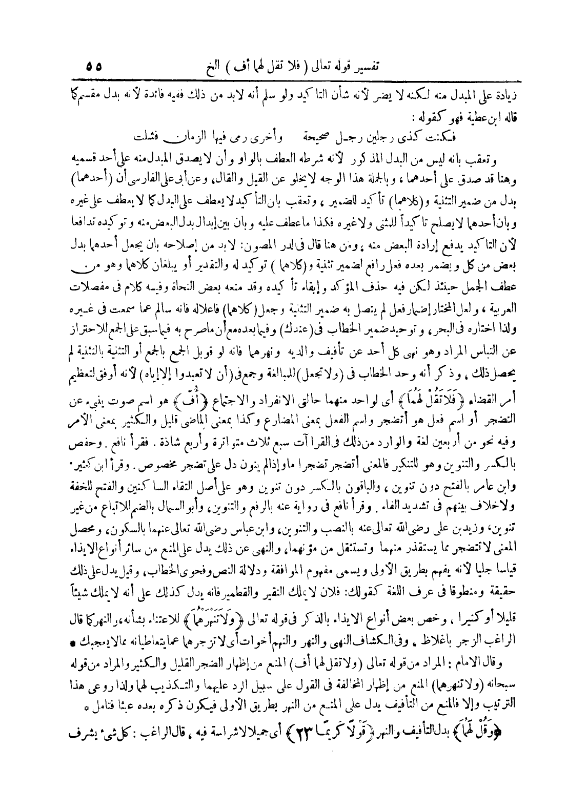 زيادة على المبدل منه لكنه لا يضر لأنه شأن التأكيد ولو سلم أنه لابد من ذلك ففيه فائدة لأنه بدل مقسم كما قاله ابن عطية فهو كقوله : فكنت كذي رجلين رجل صحيحة وأخرى رمى فيها الزمان فشلت وتعقب بأنه ليس من البدل المذكور لأنه شرطه العطف بالواو وأن لا يصدق المبدل منه على أحد قسميه وهما قد صدق على أحدهما وبالجملة هذا الوجه لا يخلو عن القيل والقال وعن أبي علي الفارسي أن أحدهما بدل من ضمير التثنية و كلاهما تأكيد للضمير وتعقيب بأن التأكيد لا يعطف على البدل كما لا يعطف على غيره وبأن أحدهما لا يصلح تأكيدا للمثنى ولا غيره فكذا ما عطف عليه وبأن بين إبدال البعض منه وتوكيده تدافعا لأن التأكيد يدفع إرادة البعض منه ومن هنا قال في الدر المصون : لا بد من إصلاحه بأن يجعل أحدهما بدل بعض من كل ويضمر بعده فعل رافع لضمير تثنية و كلاهما توكيد له والتقدير أو يبلغان كلاهما وهو من عطف الجمل حينئذ لكن فيه حذف المؤكد وإبقاء تأكيده وقد منعه بعض النحاة وفيه كلام في مفصلات العربية ولعل المختار إضمار فعل لم يتصل به ضمير التثنية وجعل كلاهما فاعلا له فإنه سالم عما سمعت في غيره ولذا اختاره في البحر وتوحيد ضمير الخطاب في عندك وفيما بعده مع أن ما صرح به فيما سبق على الجمع للاحتراز عن التباس المراد وهو نهي كل أحد عن تأفيف والديه ونهرهما فإنه لو قوبل الجمع بالجمع أو التثنية بالتثنية لم يحصل ذلك وذكر أنه وحد الخطاب في ولا تجعل للمبالغة وجمع في أن لا تعبدوا إلا إياه لأنه أوفق لتعظيم أمر القضاء فلا تقل لهما أي لواحد منهما حالتي الانفراد والاجتماع أف هو اسم صوت ينبيء عن التضجر أو اسم فعل هو أتضجر واسم الفعل بمعنى المضارع وكذا بمعنى الماضي قليل والكثير بمعنى الأمر وفيه نحو من أربعين لغة والوارد من ذلك في القراآت سبع ثلاث متواترة وأربع شاذة فقرأ نافع وحفص بالكسر والتنوين وهو للتنكير فالمعنى أتضجر تضجرا ما وإذا لم ينون دل على تضجر مخصوص وقرأ ابن كثير وابن عامر بالفتح دون تنوين والباقون بالكسر دون تنوين وهو على أصل التقاء الساكنين والفتح للخفة ولا خلاف بينهم في تشديد الفاء وقرأ نافع في رواية عنه بالرفع والتنوين وأبو السمال بالضم للاتباع من غير تنوين وزيد بن علي رضي الله تعالى عنه بالنصب والتنوين وابن عباس رضي الله تعالى عنهما بالسكون ومحصل المعنى لا تتضجر مما يستقذر منهما وتستثقل من مؤنهما والنهي عن ذلك يدل على المنع من سائر أنواع الايذاء قياسا جليا لأنه يفهم بطريق الأولى ويسمى مفهوم الموافقة ودلالة النص وفحوى الخطاب وقيل يدل على ذلك حقيقة ومنطوقا في عرف اللغة كقولك : فلان لا يملك النقير والقطمير فإنه يدل كذلك على أنه لا يملك شيئا قليلا أو كثيرا وخص بعض أنواع الايذاء بالذكر في قوله تعالى ولا تنهرهما للاعتناء بشأنه والنهر كما قال أراغب الزجر بإغلاظ وفي الكشاف النهي والنهر والنهم أخوات أي لا تزجرهما عما يتعاطيانه مما لا يعجبك