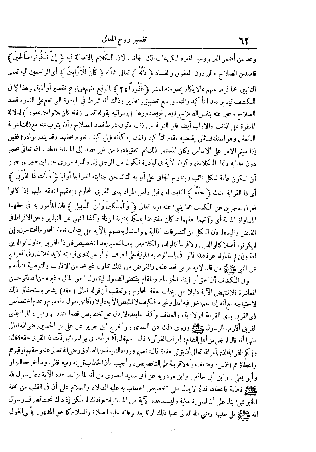 وعد لمن أضمر البر ووعيد لغيره لكن غلب ذلك الجانب لأن الكلام بالأصالة فيه إن تكونوا صالحين قاصدين الصلاح والبر دون العقوق والفساد فإنه تعالى شأنه كان للأوابين أي الراجعين إليه تعالى التائبين عما فرط منهم مما لا يكاد يخلو من البشر غفورا 52 لما وقع منهم من نوع تقصير أو أذية وهذا كما في الكشف تيسير بعد التأكيد والتعسير مع تضييق وتحذير وذلك أنه شرط في البادرة التي تقع على الندرة قصد الصلاح وعبر عنه بنفس الصلاح ولم يصرح بصدورها بل رمز إليه بقوله تعالى فإنه كان للأوابين غفورا لدلالة المغفرة على الذنب والأواب أيضا فإن التوبة عن ذنب يكون بشرط قصد الصلاح وأن يتوب عنه مع ذلك التوبة البالغة وهو استئناف ثان يقتضيه مقام التأكيد والتشديد كأنه قيل : كيف نقوم بحقهما وقد يندر بوادر فقيل إذا بنيتم الأمر على الأساس وكان المستمر ذلك ثم اتفق بادرة من غير قصد إلى المساءة فلطف الله تعالى يحجز دون عذابه قائما بالكلاءة وكون الآية في البادرة تكون من الرجل إلى والديه مروي عن ابن جبير وجوز أن تكون عامة لكل تائب ويندرج الجاني على أبويه التائب من جنايته اندراجا أوليا وءات ذا القربى أي ذا القرابة منك حقه الثابت له قيل ولعل المراد بذي القربى المحارم وبحقهم النفقة عليهم إذا كانوا فقراء عاجزين عن الكسب عما ينبيء عنه قوله تعالى والمسكين وابن السبيل فإن المأمور به في حقهما المساواة المالية أي وآتهما حقهما مما كان مفترضا بمكة بمنزلة الزكاة وكذا النهي عن التبذير وعن الإفراط في القبض والبسط فإن الكل من التصرفات المالية واستدل بعضهم بالآية على إيجاب نفقة المحارم المحتاجين وإن لم يكونوا أصلا كالوالدين ولا فرعا كالولد والكلام من باب التعميم بعد التخصيص فإن ذا القربى يتناول الوالدين لغة وإن لم يتناوله عرفا فلذا قالوا في باب الوصية المبنية على العرف : لو أوصى لذوي قرابته لا يدخلان وفي المعراج عن النبي من قال لأبيه قربى فقد عقه والغرض من ذلك تناول غيرهما من الأقارب والتوصية بشأنه