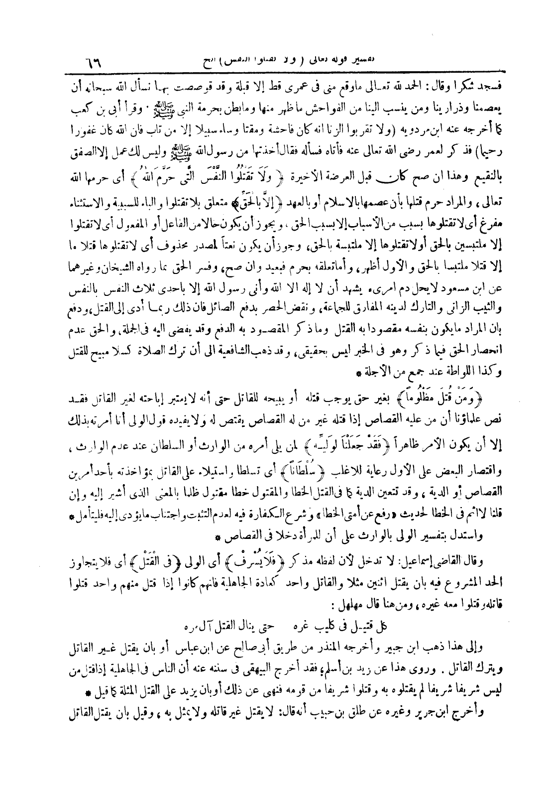 فسجد شكرا وقال : الحمد لله تعالى ما وقع مني في عمري قط إلا قبلة وقد قوصصت بها نسأل الله سبحانه أن يعصمنا وذرياتنا ومن ينسب إلينا من الفواحش ما ظهر منها وما بطن بحرمة النبي وقرأ أبي بن كعب كما أخرجه عنه ابن مردويه ولا تقربوا الزنا إنه كان فاحشة وساء سبيلا إلا من تاب فإن الله كان غفورا رحيما فذكر لعمر رضي الله تعالى عنه فأتاه فسأله فقال أخذتها من رسول الله وليس لك عمل إلا الصفق بالنقيع وهذا إن صح كان قبل العرضة الأخيرة ولا تقتلوا النفس التي حرم الله أي حرمها الله تعالى والمراد حرم قتلها بأن عصمها بالإسلام أو بالعهد إلا بالحق متعلق بلا تقتلوا والباء للسببية والاستثناء مفرغ أي لا تقتلوها بسبب من الأسباب إلا بسبب الحق ويجوز أن يكون حالا من الفاعل أو المفعول أي لا تقتلوا إلا ملتبسين بالحق أو لا تقتلوها إلا ملتبسة بالحق وجوز أن يكون نعتا لمصدر محذوف أي لا تقتلوها قتلا ما إلا قتلا ملتبسا بالحق والأول أظهر وأما تعلقه بحرم فبعيد وإن صح وفسر الحق مما رواه الشيخان وغيرهما عن ابن مسعود لا يحل دم امريء يشهد أن لا إله إلا الله وأني رسول الله إلا بإحدى ثلاث النفس بالنفس والثيب الزاني والتارك لدينه المفارق للجماعة ونقض الحصر بدفع الصائل فإن ذلك ربما أدى إلى القتل ودفع بأن المراد ما يكون بنفسه مقصودا به القتل وما ذكر المقصود به الدفع وقد يفضي إليه في الجملة والحق عدم انحصار الحق فيما ذكر وهو في الخبر ليس بحقيقي وقد ذهب الشافعية إلى أن ترك الصلاة كسلا مبيح للقتل وكذا اللواطة عند جمع من الأجلة