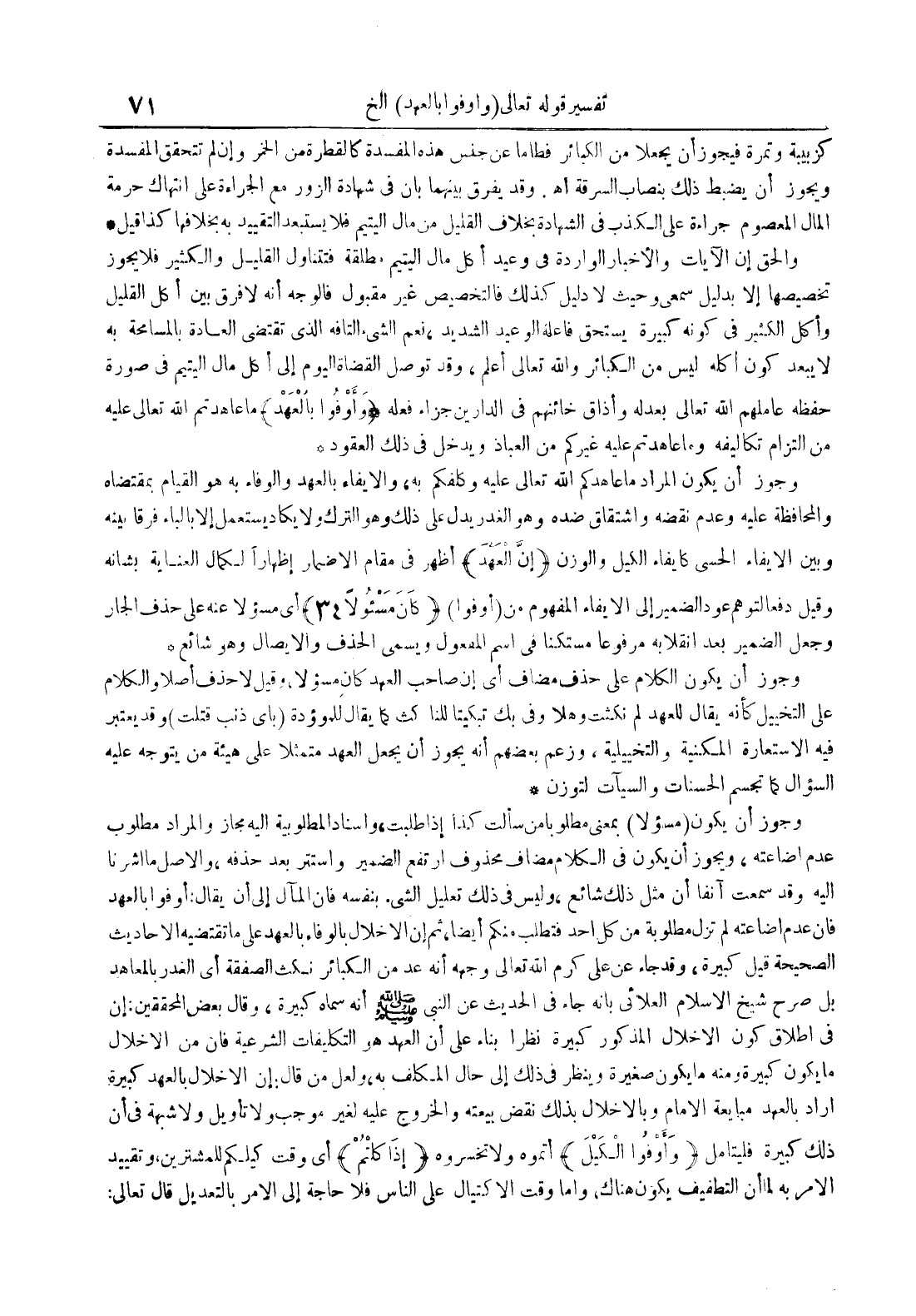 وجوز أن يكون مسؤلا بمعنى مطلوبا من سألت كذا إذا طلبت وإسناد المطلوبية إليه مجازا والمراد مطلوب عدم إضاعته ويجوز أن يكون في الكلام مضاف محذوف ارتفع الضمير واستتر بعد حذفه والأصل ما أشرنا إليه وقد سمعت آنفا أن مثل ذلك شائع وليس في ذلك تعليل الشيء بنفسه فإن المآل إلى أن يقال : أوفوا بالعهد فإن عدم إضاعته لم تزل مطلوبة من كل أحد فتطلب منكم أيضا ثم إن الإخلال بالوفاء بالعهد على ما تقتضيه الأحاديث الصحيحة قيل كبيرة وقد جاء عن علي كرم الله وجهه أنه عد من الكبائر نكث الصفقة أي الغدر بالمعاهد بل صرح شيخ الإسلام العلائي بأنه جاء في الحديث عن النبي أنه سماه كبيرة وقال بعض المحققين : إن في إطلاق كون الإخلال المذكور كبيرة نظرا بناء على أن العهد هو التكليفات الشرعية فإن من الإخلال ما يكون كبيرة ومنه ما يكون صغيرة وينظر في ذلك إلى حال المكلف به ولعل من قال : إن الإخلال بالعهد كبيرة أراد بالعهد مبايعة الإمام وبالإخلال بذلك نقض بيعته والخروج عليه لغير موجب ولا تأويل ولا شبهة في أن ذلك كبيرة فليتأمل وأوفوا الكيل أتموه ولا تخسروه إذا كلتم أي وقت كيلكم للمشترين وتقييد الأمر به لما أن التطفيف يكون هناك وأما وقت الاكتيال على الناس فلا حاجة إلى الأمر بالتعديل قال تعالى :