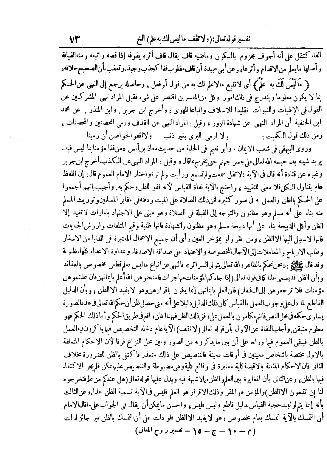 ما ليس لك به علم أي لا تتبع ما لا علم لك به من قول أو فعل وحاصله يرجع إلى النهي عن الحكم بما لا يكون معلوما ويندرج في ذلك أمور وكل من المفسرين اقتصر على شيء فقيل المراد نهي المشركين عن القول في الإلهيات والنبوات تقليدا للأسلاف واتباعا للهوى وأخرج ابن جرير وابن المنذر عن محمد بن الحنفية أن المراد النهي عن شهادة الزور وقيل : المراد النهي عن القذف ورمي المحصنين والمحصنات ومن ذلك قول الكميت : ولا أرمي البري بغير ذنب ولا أقفو الحواصن إن رمينا وروى البيهقي في شعب الإيمان وأبو نعيم في الحلية من حديث معاذ بن أنس من قفا مؤمنا بما ليس فيه يريد شينه به حبسه الله تعالى على جسر جهنم حتى يخرج مما قال وقيل : المراد النهي عن الكذب أخرج ابن جرير وغيره عن قتادة أنه قال في الآية : لا تقل سمعت ولم تسمع ورأيت ولم تر واختار الإمام العموم قال : إن اللفظ عام يتناول الكل فلا معنى للتقييد واحتج بالآية نفاة القياس لأنه قفو للظن وحكم به وأجيب بأنهم أجمعوا على الحكم بالظن والعمل به في صور كثيرة فمن ذلك الصلاة على الميت ودفنه في مقابر المسلمين وتوريث المسلم منه بناء على أنه مسلم وهو مظنون والتوجه إلى القبلة في الصلاة وهو مبني على الاجتهاد بإمارات لا تفيد إلا الظن ولأكل الذبيحة بناء على أنها ذبيحة مسلم وهو مظنون والشهادة فإنها ظنية وقيم المتلفات واروش الجنايات فإنها لا سبيل إليها إلا الظن ومن نظر ولو بمؤخرة العين رأى أن جميع الأعمال المعتبرة في الدنيا من الأسفار وطلب الأرباح والمعاملات إلى الآجال المخصوصة والاعتماد على صداقة الأصدقاء وعداوة الأعداء كلها مظنونة وقد قال : نحن نحكم بالظاهر والله تعالى يتولى السرائر فالنهي عن اتباع ما ليس بعلم قطعي مخصوص بالعقائد وبأن الظن قد يسمى علما كما في قوله تعالى إذا جاءكم المؤمنات مهاجرات فامتحنوهن الله أعلم بإيمانهن فإن علمتوهن مؤمنات فلا ترجعوا إلى الكفار فإن العلم بإيمانهن إنما يكون بإقرارهن وهو لا يفيد إلا الظن وبأن الدليل القاطع لما دل على وجوب العمل بالقياس كان ذلك الدليل دليلا على أنه متى حصل ظن أن حكم الله تعالى في هذه الصورة يساوي حكمه في محل النص فأنتم مكلفون بالعمل على وفق ذلك الظن فههنا الظن واقع في طريق الحكم وأما ذلك الحكم فهو معلوم متيقن وأجاب النفاة عن الأول بأن قوله تعالى لا تقف الآية عام دخله التخصيص فيما يذكرون فيه العمل بالظن فيبقى العموم فيما وراءه على أن بين ما يذكرونه من الصور وبين محل النزاع فرقا لأن الأحكام المتعلقة بالأول مختصة بأشخاص معينين في أوقات معينة فالتنصيص على ذلك متعذر فاكتفى بالظن للضرورة بخلاف الثاني فإن الأحكام المثبتة بالأقيسة كلية معتبرة في وقائع كلية وهي مضبوطة والتنصيص عليها ممكن فلم يجز الاكتفاء فيها بالظن وعن الثاني بأن المغايرة بين العلم والظن مما لا شبهة فيه ويدل عليها قوله تعالى هل عندكم من علم فتخرجوه لنا إن تتبعون إلا الظن والمؤمن هو المقر وذلك الاقرار هو العلم فليس في الآية تسمية الظن علما وعن الثالث بأنه إنما يتم لو ثبت حجية القياس بدليل قاطع وليس فليس وأحسن ما يمكن أن يقال في الجواب على ما قال الإمام أن التمسك بالآية تمسك بعام مخصوص وهو لا يفيد إلا الظن فلو دلت على أن التمسك بالظن غير جائز لدلت