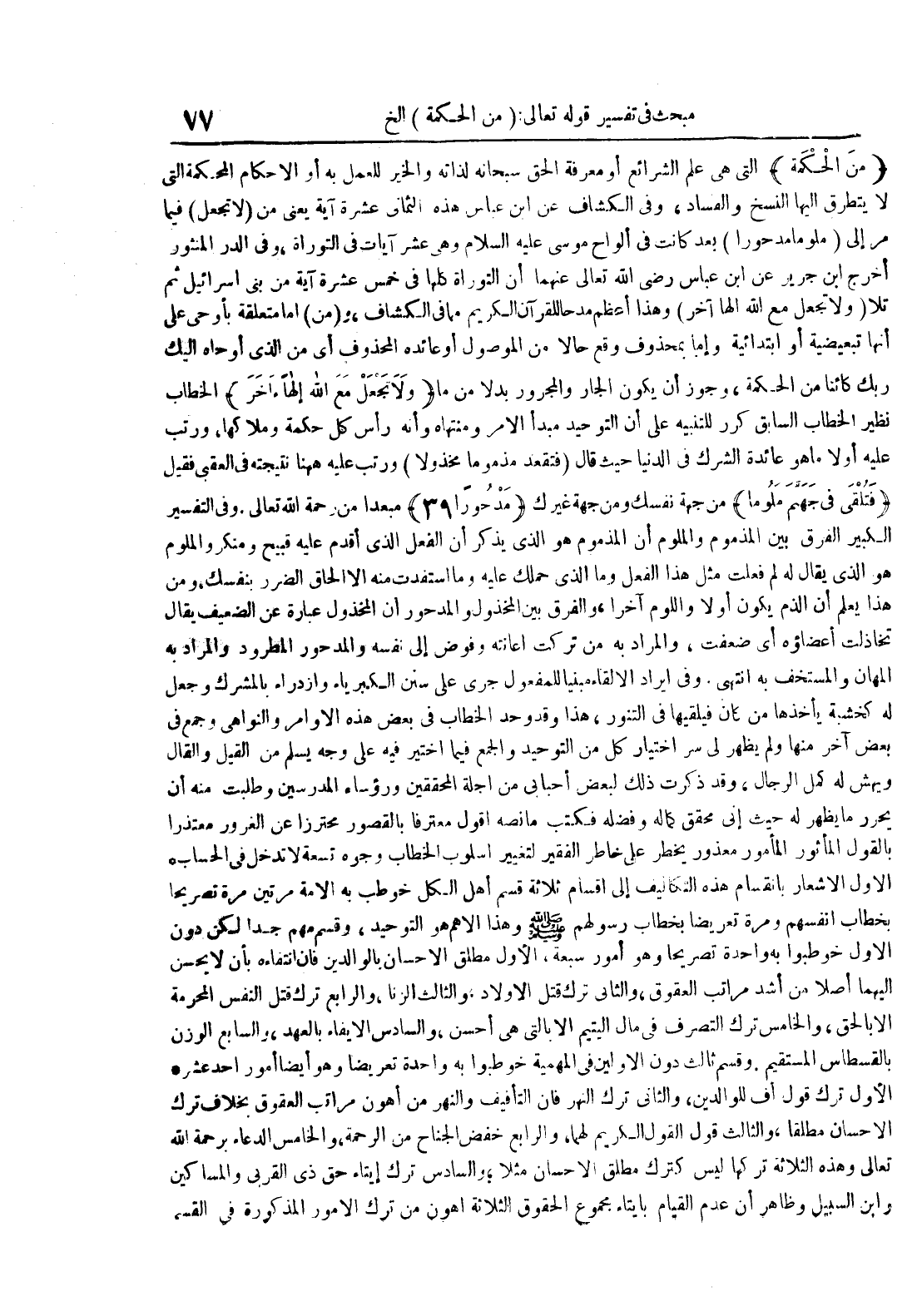 من الحكمة التي هي علم الشرائع أو معرفة الحق سبحانه لذاته والخير للعمل به أو الأحكام المحكمة التي لا يتطرق إليها النسخ والفساد وفي الكشاف عن ابن عباس هذه الثماني عشرة آية يعني من لا تجعل فيما مر إلى ملوما مدحورا بعد كانت في ألواح موسى عليه السلام وهي عشر آيات في التوراة وفي الدر المنثور أخرج ابن جرير عن ابن عباس رضي الله عنهما أن التوراة كلها خمس عشرة آية من بني إسرائيل ثم تلا ولا تجعل مع الله إلها آخر وهذا أعظم مدحا للقرآن الكريم ما في الكشاف و من إما متعلقة بأوحى على أنها تبعيضية أو ابتدائية وإما بمحذوف وقع حالا من الموصول أو عائده المحذوف أي من الذي أوحاه إليك ربك كائنا من الحكمة وجوز أن يكون الجار والمجرور بدلا من ما ولا تجعل مع الله إلها آخر الخطاب نظير الخطاب السابق كرر للتنبيه على أن التوحيد مبدأ الأمر ومنتهاه وأنه رأس كل حكمة وملاكها ورتب عليه أولا ما هو عائد للشرك في الدنيا حيث قال فتقعد مذموما مخذولا ورتب عليه ههنا نتيجته في العقبى فقيل فتلقى في جهنم ملوما من جهة نفسك ومن جهة غيرك مدحورا 93 مبعدا من رحمة الله تعالى وفي التفسير الكبير الفرق بين المذموم والملوم أن المذموم هو الذي يذكر أن الفعل الذي أقدم عليه قبيح ومنكر والملوم هو الذي يقال له لم فعلت مثل هذا الفعل وما الذي حملك عليه وما استفدت منه إلا إلحاق الضرر بنفسك ومن هذا يعلم أن الذم يكون أولا واللوم آخرا والفرق بين المخذول والمدحور أن المخذول عبارة عن الضعيف يقال تخاذلت أعضاؤه أي ضعفت والمراد به من تركت إعانته وفوض إلى نفسه والمدحور المطرود والمراد به المهان والمستخف به انتهى وفي إيراد الالقاء مبينا للمفعول جرى على سنن الكبرياء وازدراء بالمشرك وجعل له كخشبة يأخذها من كان فيلقيها في التنور هذا وقد وحد الخطاب في بعض هذه الأوامر والنواهي وجمع في بعض آخر منها ولم يظهر لي سر اختيار كل من التوحيد والجمع فيما اختير فيه على وجه يسلم من القيل والقال ويهش له كمل الرجال وقد ذكرت ذلك لبعض أحبابي من أجلة المحققين ورؤساء المدرسين وطلبت منه أن يحرر ما يظهر له حيث إني محقق كماله وفضله فكتب ما نصه أقول معترفا بالقصور محترزا عن الغرور ومعتذرا بالقول المأثور المأمور معذور يخطر على خاطر الفقير لتغيير اسلوب الخطاب وجوه تسعة لا تدخل في الحساب