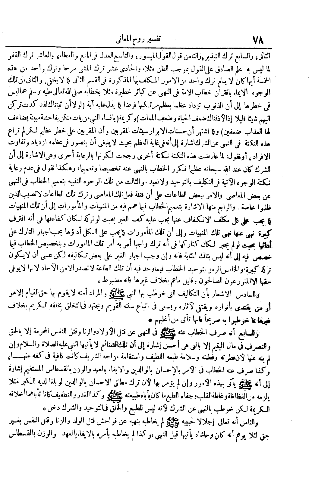 والسابع أنه صرف الخطاب عنه في النهي عن قتل الأولاد والزنا وقتل النفس المحرمة إلا بالحق والتصرف في مال اليتيم إلا بالتي هي أحسن إشارة إلى أن تلك الشنائع لا يأتيها النبي عليه الصلاة و السلام وإن لم ينه عنها لأن فطرته وفطنته وسلامة طبعه اللطيف واستقامة مزاجه الشريف كانت كافية في كفه عنها وكذا صرف عنه الخطاب في الأمر بالإحسان بالوالدين والإيفاء بالعهد والوزن بالقسطاس المستقيم إشارة إلى أنه يأتي بهذه الأمور وإن لم يؤمر بها لأن ترك مطلق الإحسان بالوالدين لو بلغا لديه الكبر مثلا يلزمه من الفظاظة وغلظة القلب وجفاء الطبع ما كان يأباه طبيعته وكذا الغدر والتطفيف كانا تأباهما أخلاقه الكريمة لكن خوطب بالنهي عن الشرك لأنه ليس للطبع والخلق في التوحيد والشرك دخل