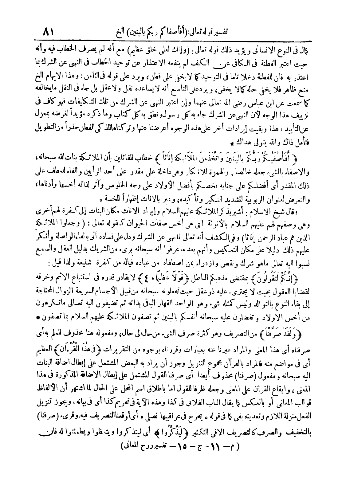 وقال شيخ الإسلام : أشير بذكر الملائكة عليهم السلام وإيراد الإناث مكان البنات إلى كفرة لهم أخرى وهي وصفهم لهم عليهم السلام بالأنوثة التي هي أخس صفات الحيوان كقوله تعالى : وجعلوا الملائكة الذين هم عباد الرحمن إناثا وفي الكشف أنه تعالى لما نهى عن الشرك ودل على فساده أتى بالفاء الواصلة وأنكر عليهم ذلك دليلا على مكان التعكيس وأنهم بعد ما عرفوا أنه سبحانه بريء من الشرك بدليل العقل والسمع نسبوا إليه تعالى ما هو شرك ونقص وازدراء بمن أصطفاه من عباده فيا له من كفرة شنيعة ولذا قيل : إنكم لتقولون بمقتضى مذهبكم الباطل قولا عظيما 04 لا يقادر قدره في استتباع الاثم وخرقه لقضايا العقول بحيث لا يجتريء عليه ذو عقل حيث تجعلونه سبحانه من قبيل الأجسام السريعة الزوال المحتاجة إلى بقاء النوع بالتوالد وليس كمثله شيء وهو الواحد القهار الباقي بذاته ثم تضيفون إليه تعالى ما تكرهون من أخس الأولاد وتفضلون عليه سبحانه أنفسكم بالبنين ثم تصفون الملائكة عليهم السلام بما تصفون