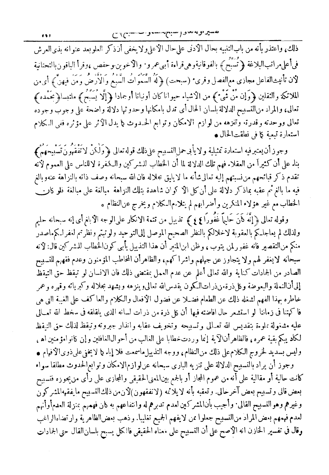 وجوز أن يراد بالتسبيح الدلالة على تنزيه الباري سبحانه عن لوازم الامكان وتوابع الحدوث مطلقا سواء كانت حالية أو مقالية على أنه من عموم المجاز أو بالجمع بين المعنى الحقيقي والمجازى على رأي من يجوزه فتسبيح بعض قالي وتسبيح بعض آخر حالي وتعقبه بأنه لا يلائمه لا تفقهون لأن من ذلك التسبيح ما يفقهه المشركون وغيرهم وهو التسبيح القالي وأجيب بأن المشركين لعدم تدبرهم له وانتفاعهم به كان فهمهم بمنزلة العدم أو أنهم لعدم فهمهم بعض المراد من التسبيح جعلوا ممن لا يفهم الجميع تغليبا وذهب بعض الظاهرية وارتضاه الراغب وقال في تفسير الخازن إنه الأصح على أن التسبيح على معناه الحقيقي فالكل يسبح بلسان القال حتى الجمادات