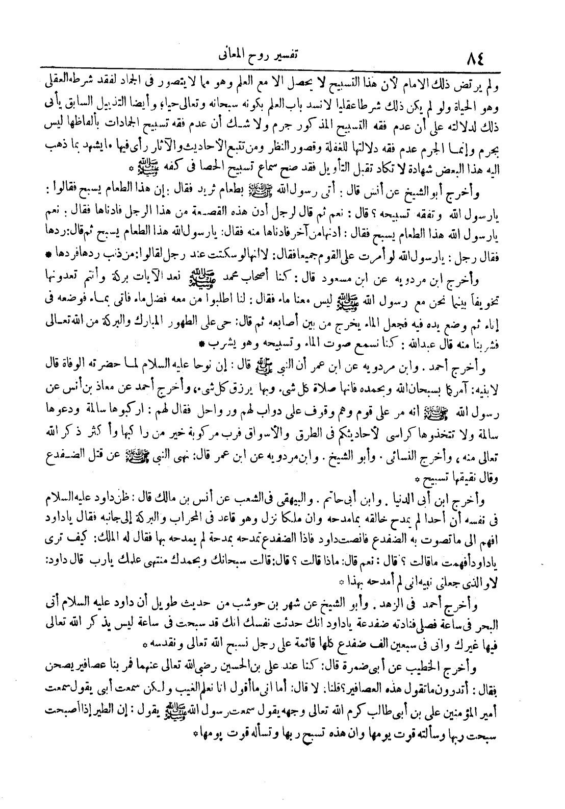 ولم يرتض ذلك الإمام لأن هذا التسبيح لا يحصل إلا مع العلم وهو مما يتصور في الجماد لفقد شرطه العقلي وهو الحياة ولو لم يكن ذلك شرطا عقليا لا نسد باب العلم لكونه سبحانه وتعالى حيا وأيضا التذييل السابق يأبى ذلك لدلالته على أن عدم فقه التسبيح المذكور جرم ولا شك أن عدم فقه تسبيح الجمادات بألفاظها ليس بجرم وإنما الجرم عدم فقه دلالتها للغفلة وقصور النظر ومن تتبع الأحاديث والآثار رأي فيها ما يشهد بما ذهب إليه هذا البعض شهادة لا تكاد تقبل التأويل فقد صح سماع تسبيح الحصا في كفه