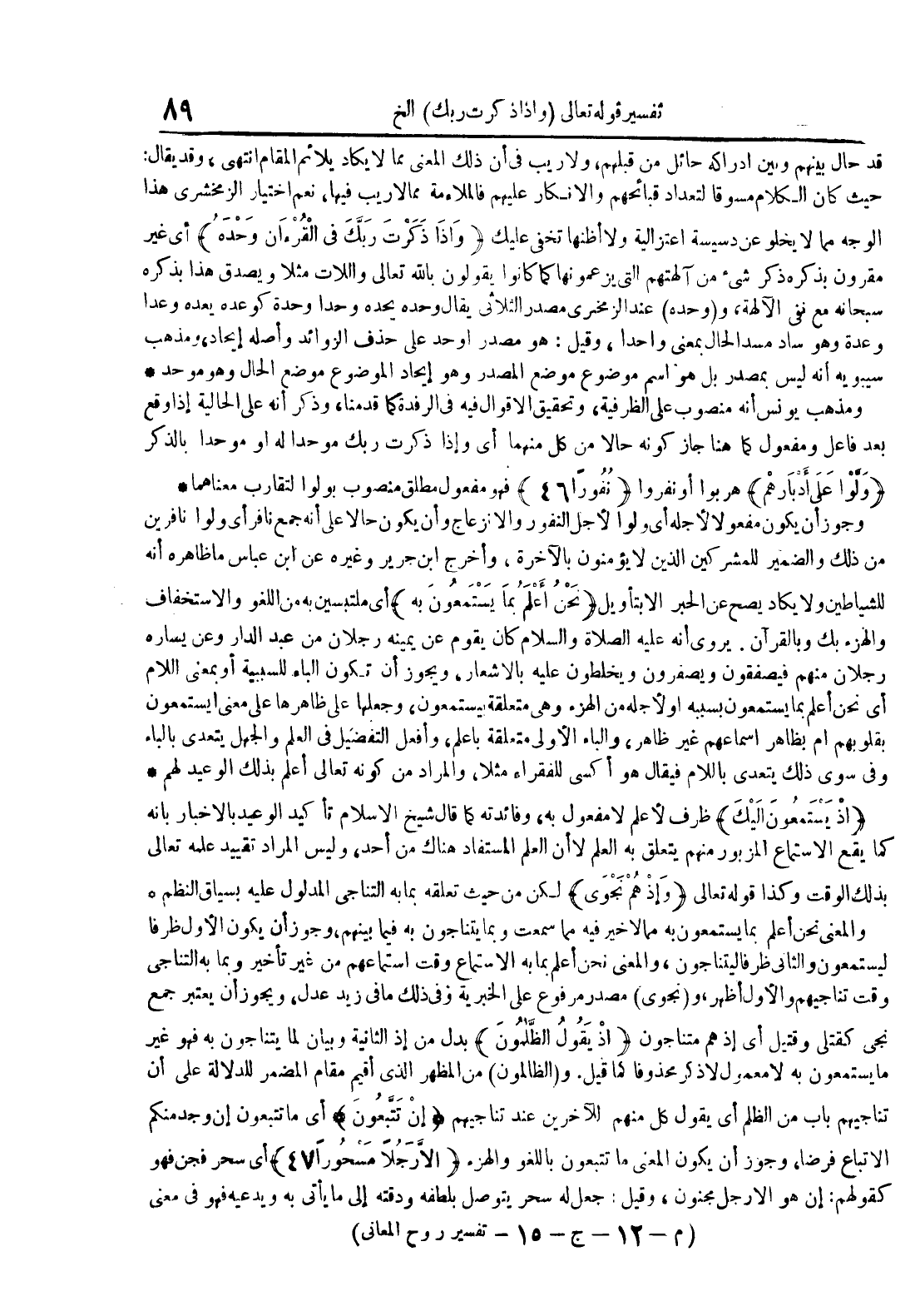 ومذهب يونس أنه منصوب على الظرفية وتحقيق الأقوال فيه في الرفدة كما قدمنا وذكر أنه على الحالية إذا وقع بعد فاعل ومفعول كما هنا جاز كونه حالا من كل منهما أي وإذا ذكرت ربك موحدا له أو موحدا بالذكر ولو على أدبارهم هربوا أو نفروا نفورا 64 فهو مفعول مطلق منصوب بولوا لتقارب معناهما