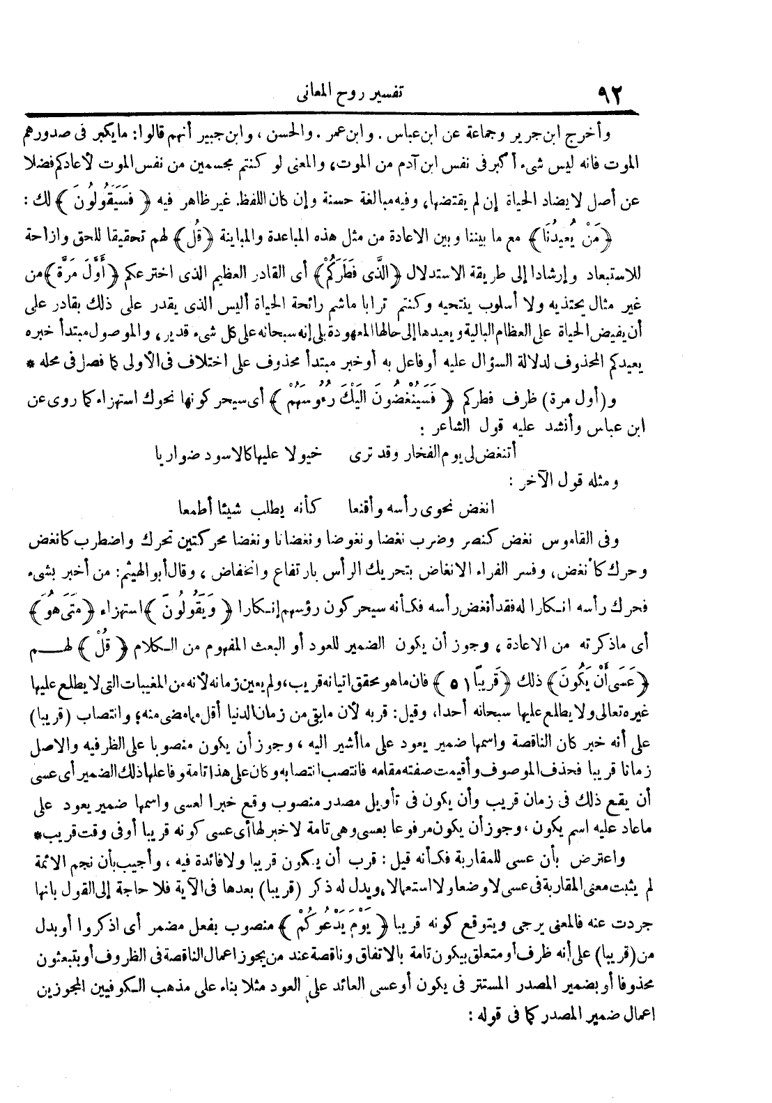 و أول مرة ظرف فطركم فسينغضون إليك رءوسهم أي سيحركونها نحوك استهزاء كما روي عن ابن عباس وأنشد عليه قول الشاعر : أتنغض لي يوم الفخار وقد ترى خيولا عليها كالأسود ضواريا ومثله قول الآخر : أنغض نحوي رأسه وأقنعا كأنه يطلب شيئا أطعما وفي القاموس نغض كنصر وضرب نغضا ونغوضا ونغضانا ونغضا محركتين تحرك واضطرب كأنغض وحرك كأنغض وفسر الفراء الانغاض بتحريك الرأس بارتفاع وانخفاض وقال أبو الهيثم : من أخبر بشيء فحرك رأسه إنكارا له فقد أنغض رأسه فكأنه سيحركون رؤسهم إنكارا ويقولون استهزاء متى هو أي ما ذكرته من الإعادة وجوز أن يكون الضمير للعود أو البعث المفهوم من الكلام قل لهم عسى أن يكون ذلك قريبا 15 فإن ما هو محقق اتيانه قريب ولم يعين زمانه لأنه من المغيبات التي لا يطلع عليها غيره تعالى ولا يطلع عليها سبحانه أحدا وقيل : قربه لأن ما بقي من زمان الدنيا أقل مما مضى منه وانتصاب قريبا على أنه خبر كان الناقصة واسمها ضمير يعود على ما أشير إليه وجوز أن يكون منصوبا على الظرفية والأصل زمانا قريبا فحذف الموصوف وأقيمت صفته مقامه فانتصب انتصابه وكان على هذا تامة وفاعلها ذلك الضمير عسى أن يقع ذلك في زمان قريب وأن يكون في تأويل مصدر منصوب وقع خبرا لعسى واسمها ضميرا يعود على ما عاد عليه اسم يكون وجوز أن يكون مرفوعا بعسى وهي تامة لا خبر لها أي عسى كونه قريبا أو في وقت قريب