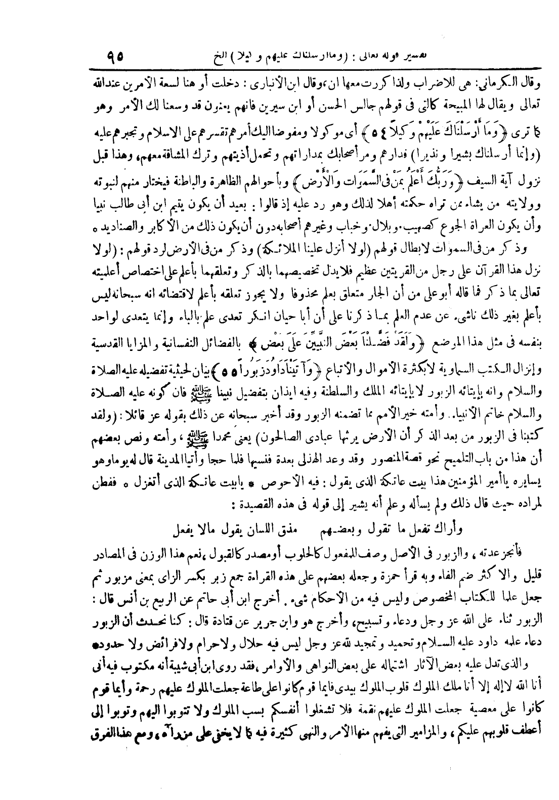 والذي تدل عليه بعض الآثار اشتماله على بعض النواهي والأوامر فقد روى ابن أبي شيبة أنه مكتوب فيه أني أنا الله لا إله إلا أنا ملك الملوك قلوب الملوك بيدي فأيما قوم كانوا على طاعة جعلت الملوك عليهم رحمة وأيما قوم كانوا على معصية جعلت الملوك عليهم نقمة فلا تشغلوا أنفسكم بسبب الملوك ولا تتوبوا إليهم وتوبوا إلي أعطف قلوبهم عليكم والمزامير التي يفهم منها الأمر والنهي كثيرة فيه كما لا يخفى على من رآه ومع هذا الفرق