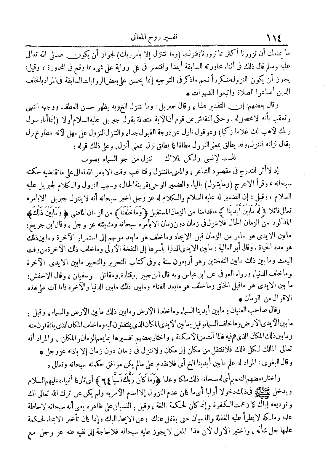 وقال بعضهم : أن التقدير هذاوقال جبريل : وما نتنزل الخ وبه يظهر حسن العطف ووجهه انتهى وتعقب بأنه لا محصل له وحكى النقاش عن قوم أن الآية متصلة بقول جبريل عليه السلام أولا انما انا رسول ربك لاهب لك غلاما زكيا وهوقول نازل عن درجة القبول جدا والتنزل النزول على مهل لأنه مطاوع نزل يقال نزلته فتنزل وقد يطلق بمعنى النزول مطلقا كما يطلق نزل بمعنى انزل وعلى ذلك قوله : فلست لإنسى ولكن لملأك تنزل من جو السماء يصوب إذ لا أثر للتدرج في مقصود الشاعر والمعنى مانتنزل وقتا غب وقت إلا بأمر الله تعالى على ما تقتضية حكمته سبحانه وقرأ الأعرج وما تنزل بالياء والضمير الموحى بقرينة الحال وسبب النزول والكلام لجبريل إلا بأمره تعالى قائلا له ما بين ايدينا ما قدامنا من الزمان المستقبل وما خلفنا من الزمان الماضي وما بين ذلك المذكور من الزمان الحال فلا ننزل في زمان دون زمان إلا بأمرة سبحانه ومشيئته عز و جل وقال ابن جريج : ما بين الايدي هو ما مر من الزمان فبل الايجاد وما خلف هو ما بعد موتهم إلىاستمرار الاخرة وما بين ذلك هو مدة الحياة وقال أبو العالية : ما بين الايدي الدنيا بأسرها إلىالنفخة الأولى وما خلف ذلك الاخرة من وقت البعث وما بين ذلك ما بين النفختين وهو اربعون سنة وفي كتاب التحرير والتحبير ما بين الايدى الاخرة وما خلف الدنيا ورواه العوفى عن ابن عباس وبه قال ابن جبير وقتادة ومقاتل وسفيان وقال الأخفش : ما بين الايدي هو ما قبل الخلق وما خلف هو ما بعد الفناء وما بين ذلك ما بين الدنيا والاخرة فالمل ات على هذه الاقوال من الزمان