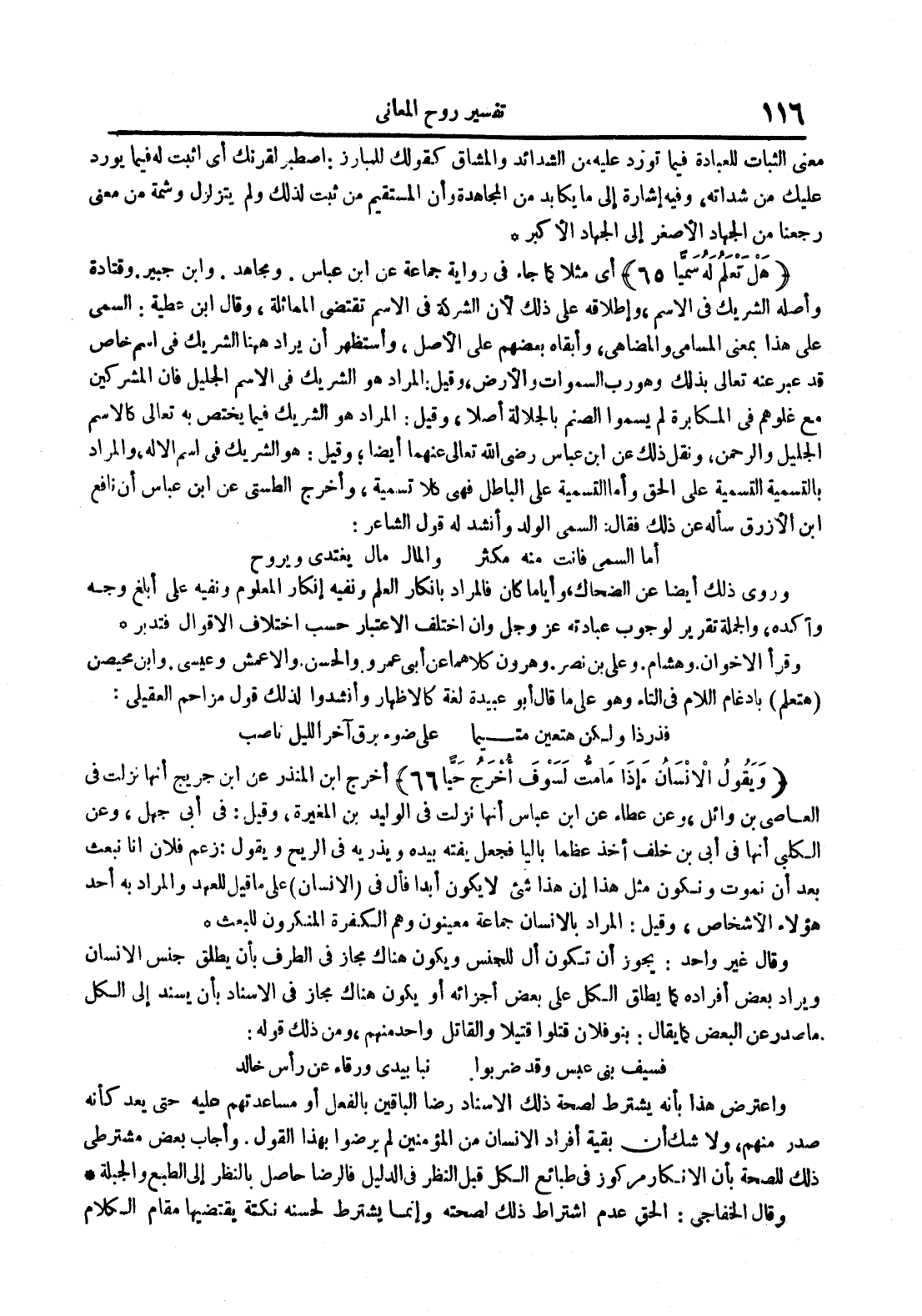 وقال غير واحد : يجوز أن تكون ال للجلس ويكون هناك مجاز في الطرف بأن يطلق جنس الانسان ويراد بعض أفراده كما يطلق الكل على بعض اجزائه أو يكون هنالك مجاز في الاسناد بأن يسند إلىالكل ما صدر عن البعض كما يقال : بنو فلان قتلوا قتيلا والقاتل واحد منهم ومن ذلك قوله : فسيف بنى عبس وقد ضربوا نبا بيدى ورقاء عن راس خالد واعترض هذا بأنه يشترط لصحة ذلك الاسناد رضا الباقين بالفعل أو مساعدتهم عليه حتى يعد كأنه صدر منه ولا شك أن بقية أفراد الانسان من المؤمنين لم يرضوا بهذا القول واجاب بعض مشترطي ذلك للصحة بأن الانكار مركوز في طبائع الكل قبل النظر في الدليل فالرضا حاصل بالنظر إلىالطبع والجبلة